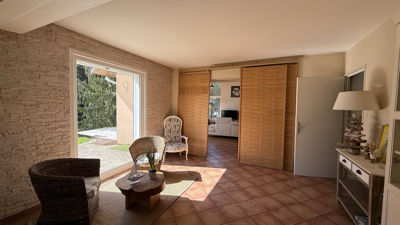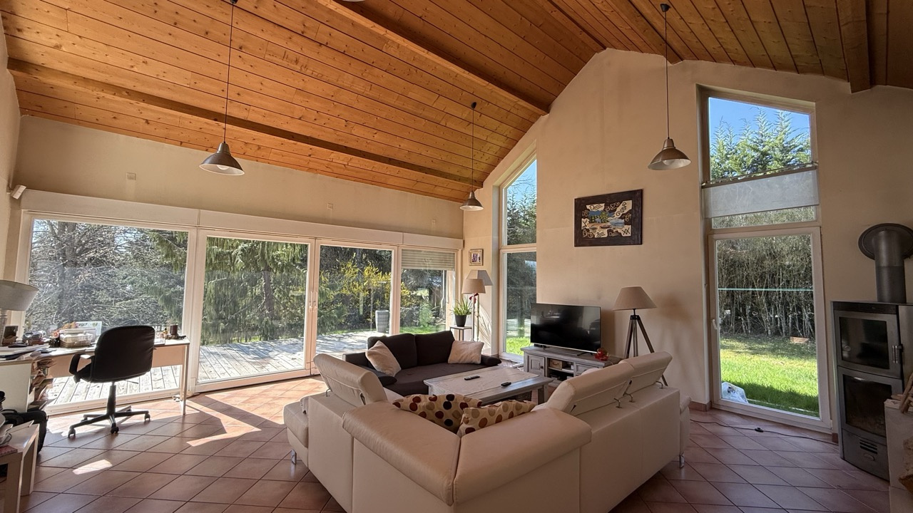 L'espace principal : SAS d'entrée ouvrant sur un séjour avec poêle à bois, une porte coulissante sépare ce lieu d'un très grand salon hauteur cathédrale avec poêle à bois constituant un très bel espace à vivre avec un accès terrasse. La cuisine équipée jouxte ces pièces. Dans la continuité, un espace bien-être (sauna, grand jacuzzi, douche), une chambre avec salle bains privative, W.C. invité.