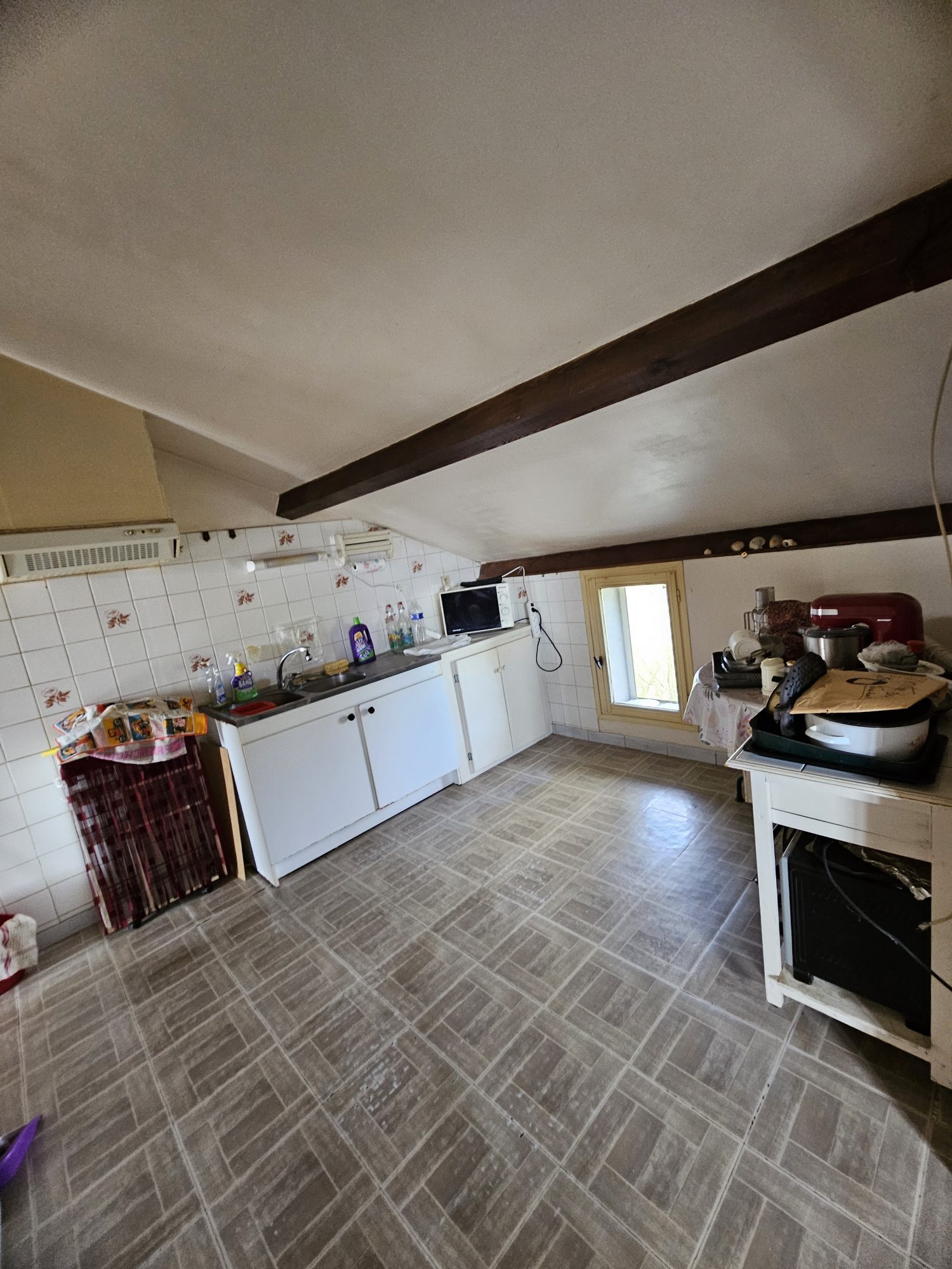 L'étage, à rafraichir, accueille 2 chambres, 1 salle d'eau, 1 WC, ainsi qu'une cuisine et un coin salon séjour.