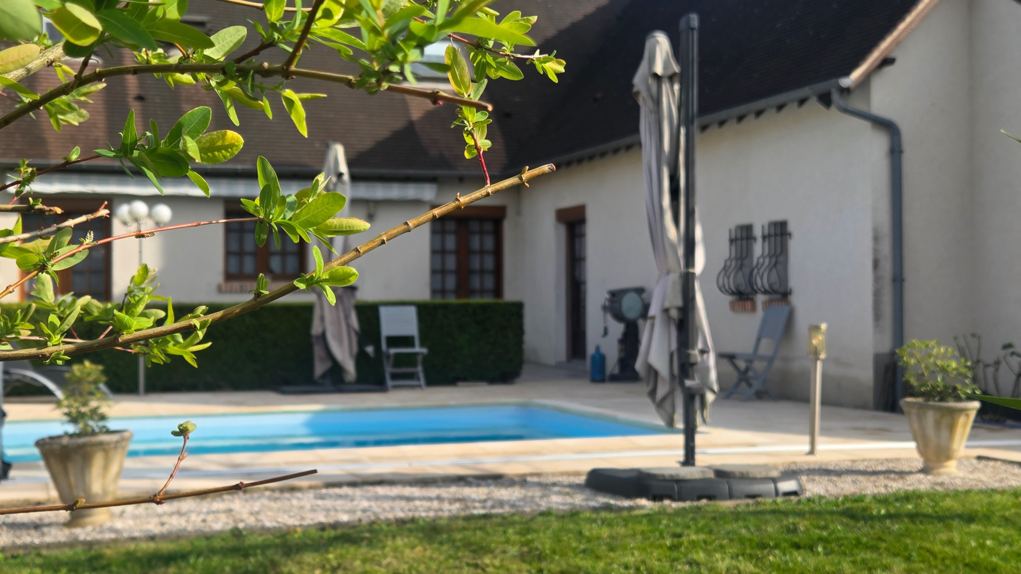 Agréable terrasse exposée sud-ouest, une piscine 4mx8m (chlore, chauffée, fermant par un dôme), pool-house, abri et chalet ; jardin arboré et fleuri, potager, puits.