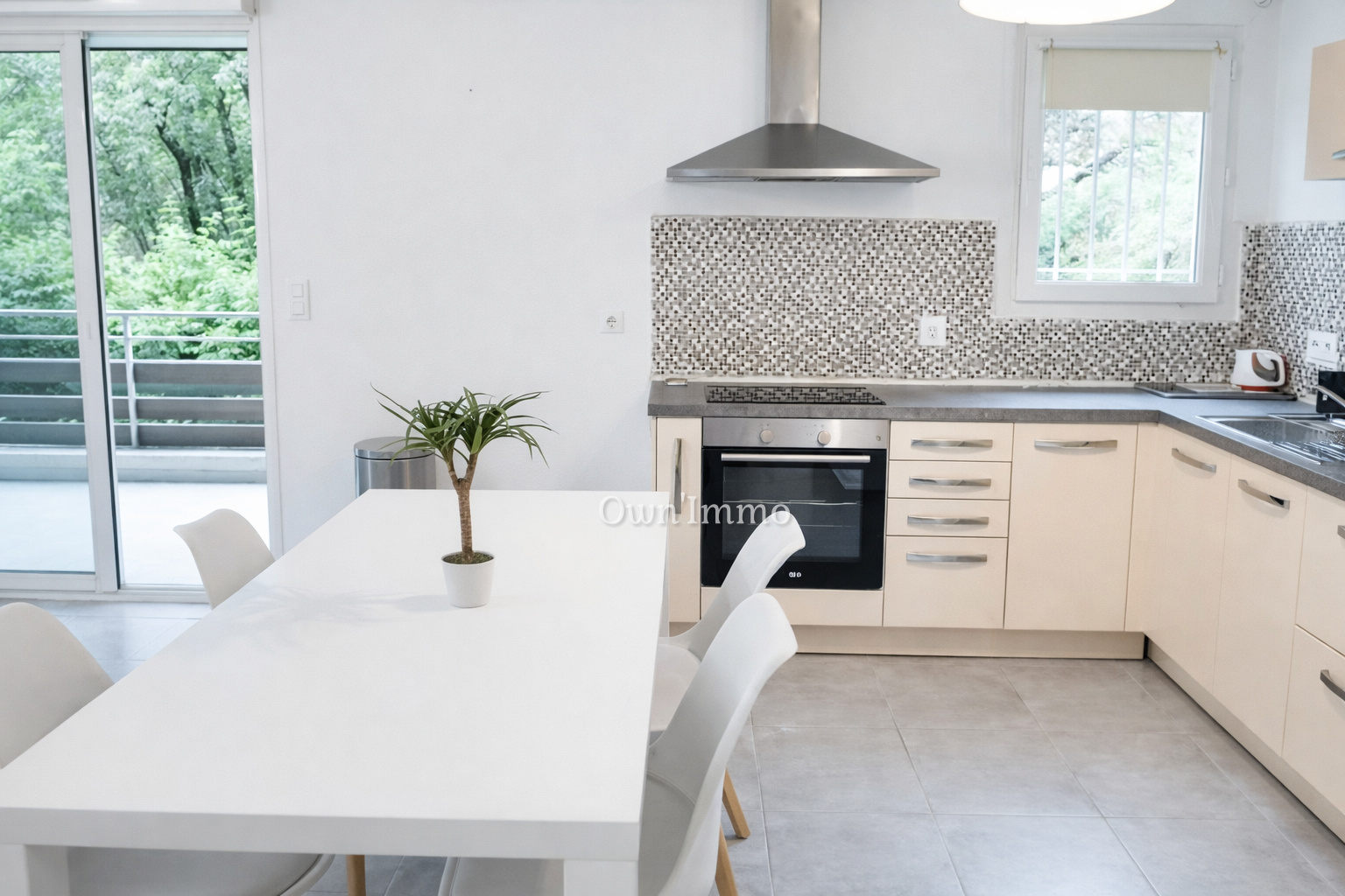 Equipement : literie en 140, chevet, étagères, canapé convertible, table et 4 chaises, table basse, meuble tv, cuisine équipée, électroménager : four, plaque à induction, réfrigérateur avec partie congélation, machine à laver séchante, placard équipé.