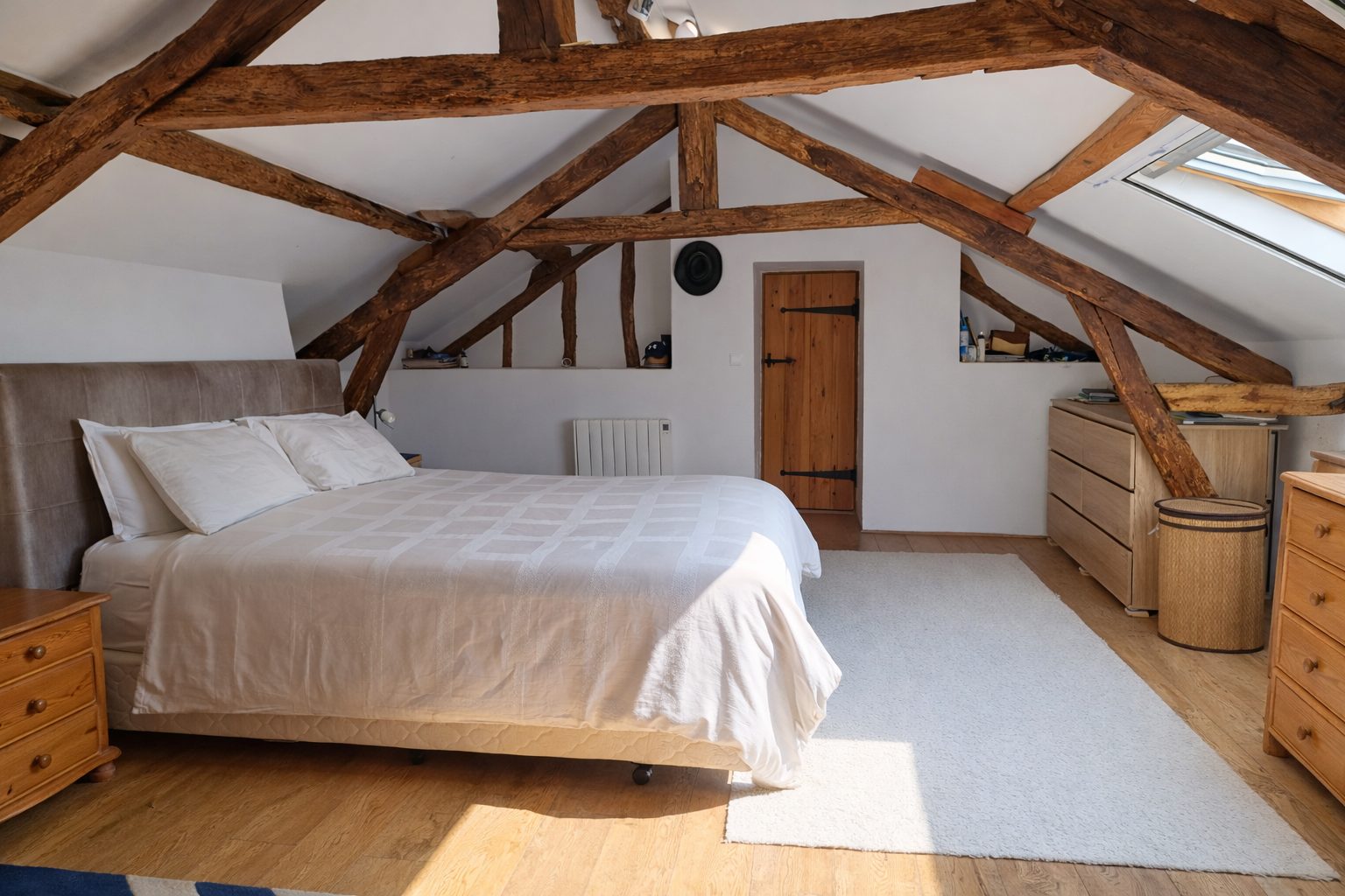 À l'étage, la maison dispose de trois chambres d'environ 17 m², 37 m² et 28 m², ainsi que de deux paliers, d'un dressing de 10 m² et d'une salle de bains familiale de 9 m². La plus grande chambre profite d'une fenêtre côté jardin et d'un grand Velux avec stores intégrés, tandis que l'étage dans son ensemble bénéficie d'une belle luminosité et d'un vrai cachet.