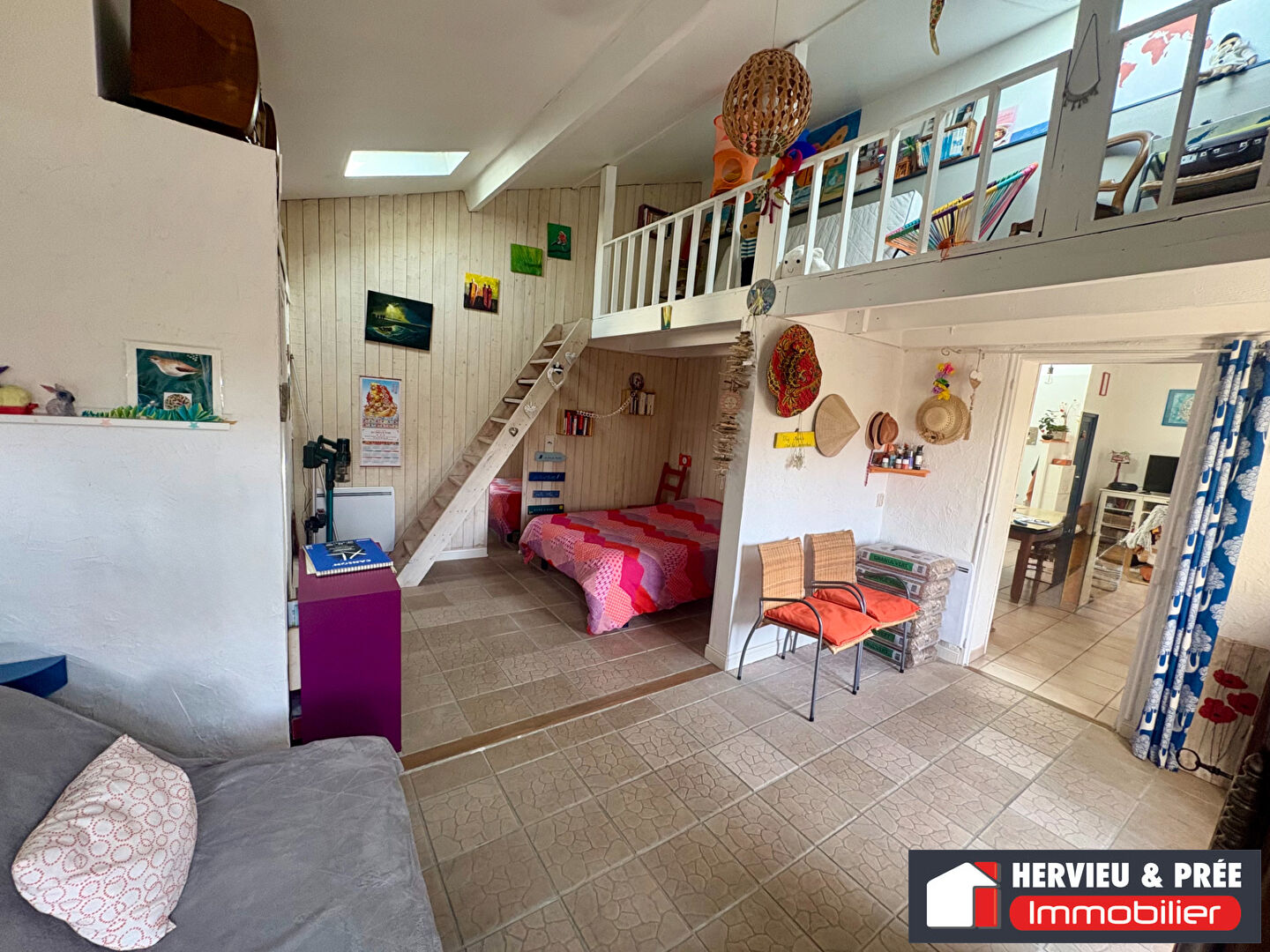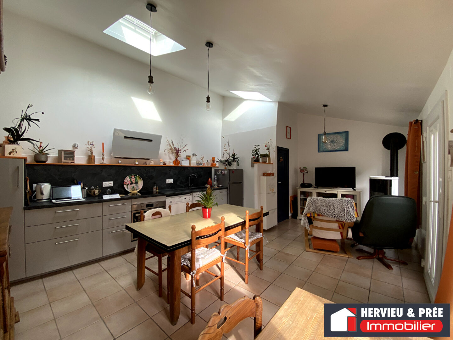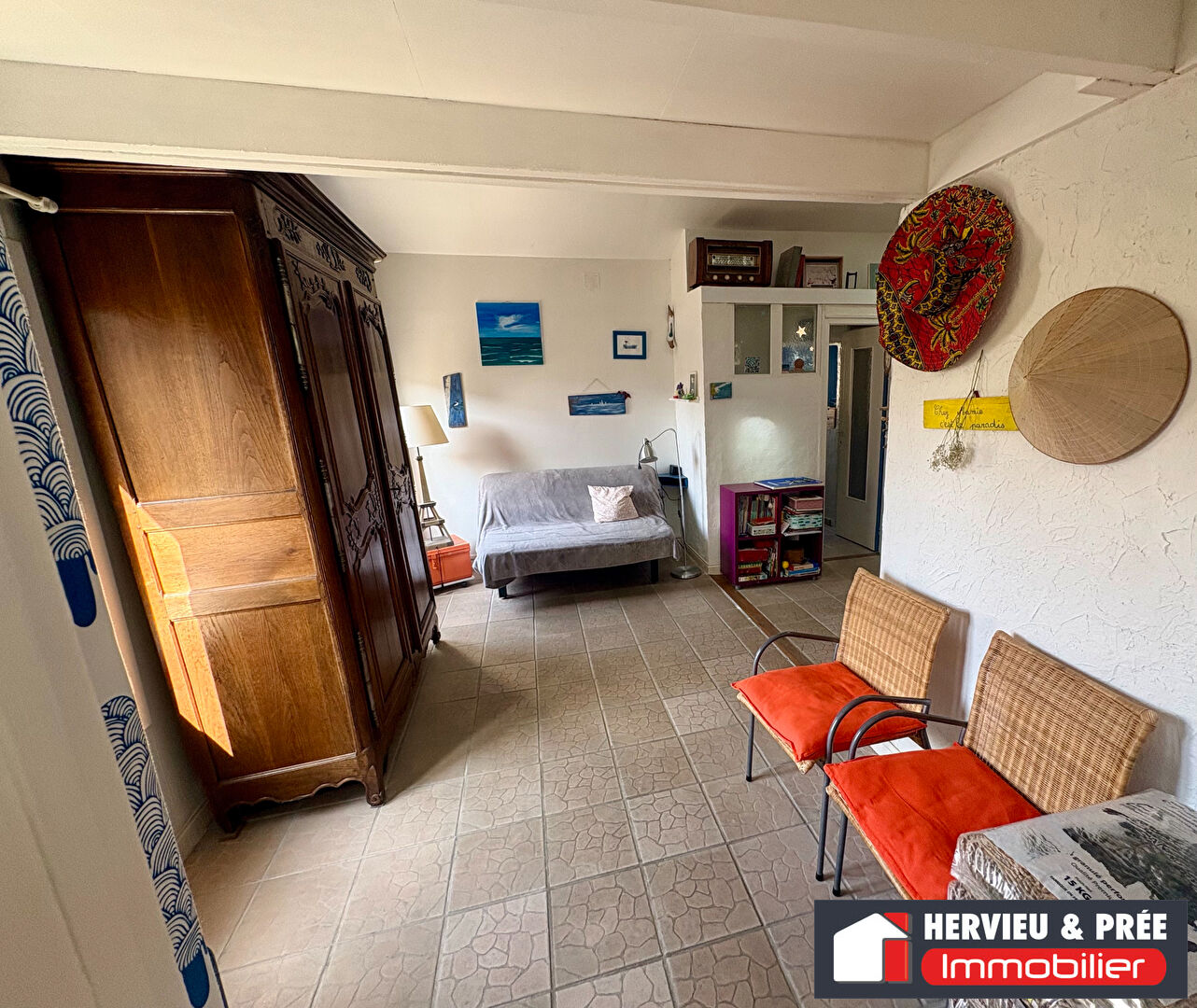 Dans un secteur calme et recherché d'HERMANVILLE SUR MER, maison de plain pied offrant une pièce de vie ensoleillée avc poêle à granulés, cuisine ouverte aménagée, wc, une chambre (possiblité autre chambre), une mezzanine, une salle de douche. Cour ensoleillée avec appentis et emplacement de stationnement.
