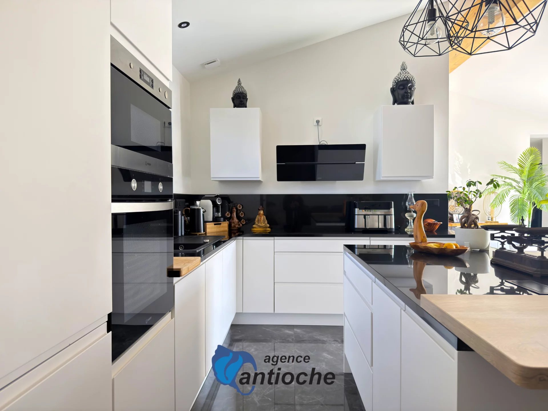 Vous découvrirez une pièce de vie de plus de 60 m², baignée de lumière et sublimée par une belle hauteur sous plafond avec charpente traditionnelle. La cuisine ouverte, aménagée et équipée (plan de travail en granit), s’intègre parfaitement à cet espace convivial, tourné vers le jardin et la piscine.