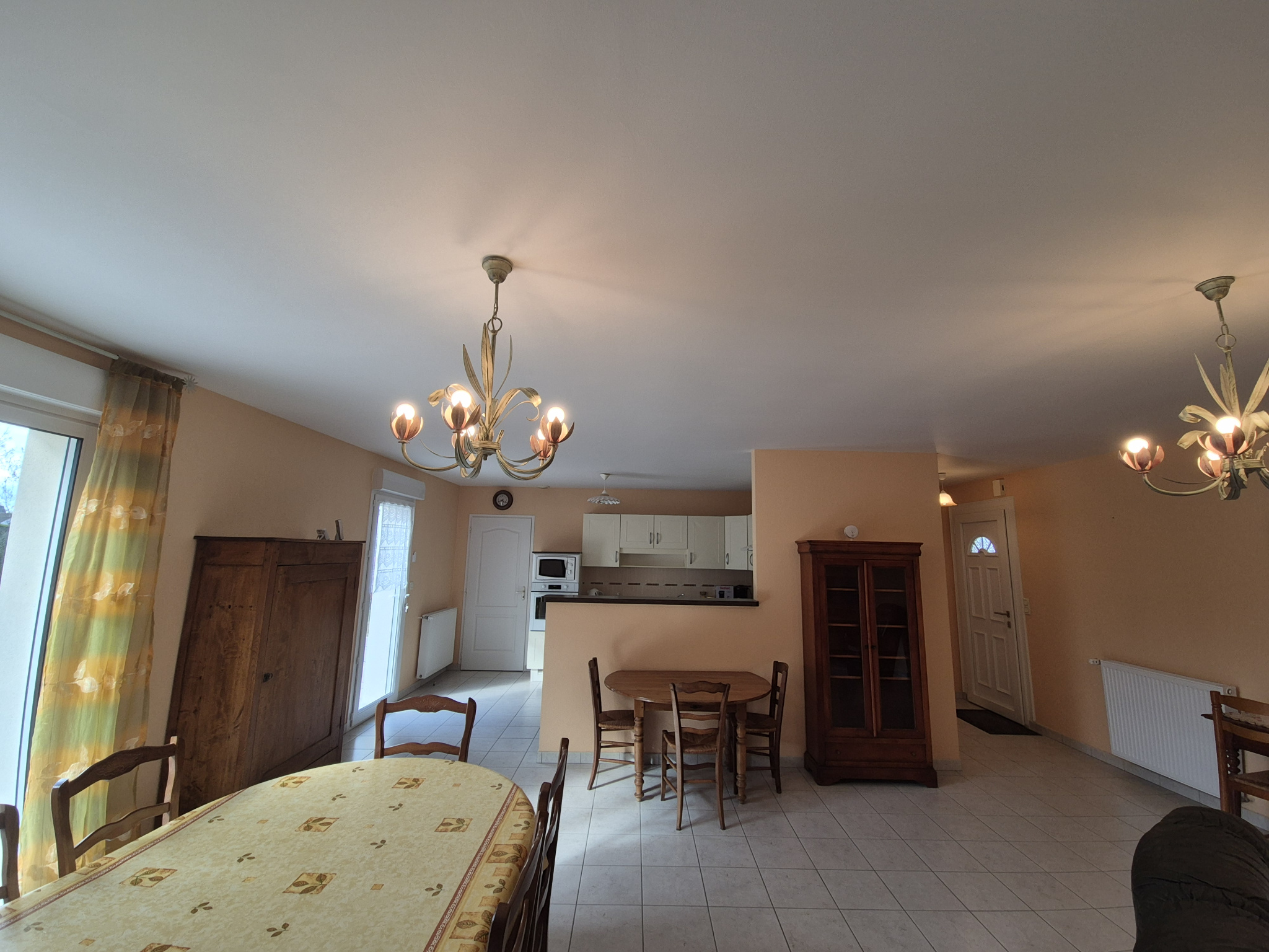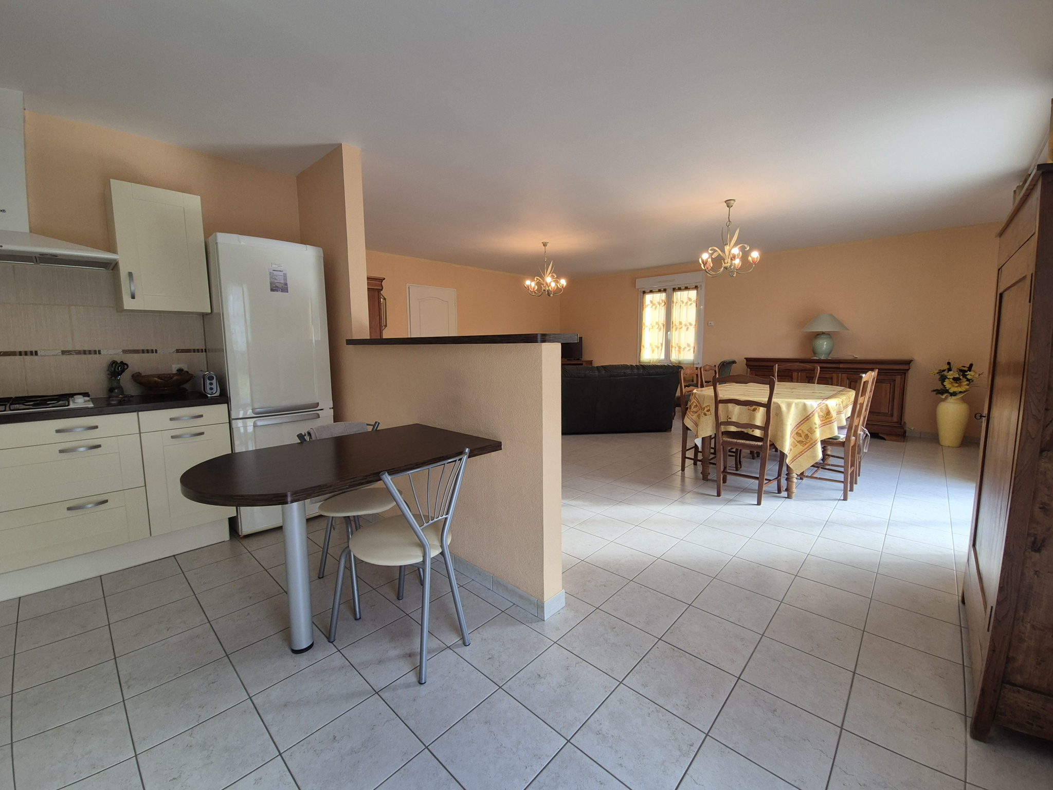 Entrée avec placard et WC séparé. Salon/salle à manger avec cuisine ouverte aménagée et équipée. Arrière-cuisine. 3 chambres et salle d'eau avec WC. Garage attenant avec grenier. Jardin de 645 m2 et terrasse avec store banne.