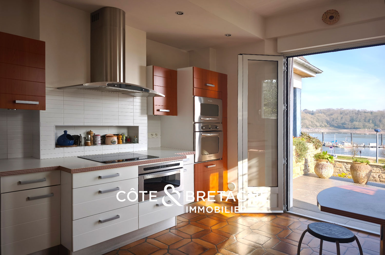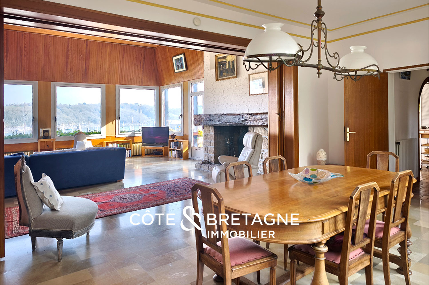 Dès l'entrée, la pièce principale de près de 60 m2 impressionne par ses volumes et ses ouvertures panoramiques. La lumière naturelle traverse l'espace, mettant en valeur la vue sur le Trieux d'un côté et le parc verdoyant de l'autre.