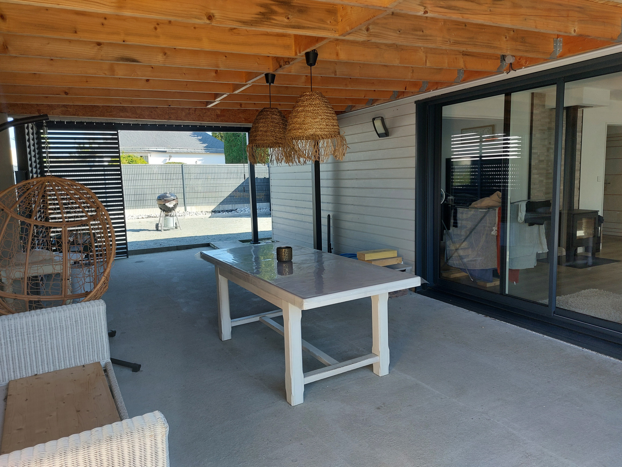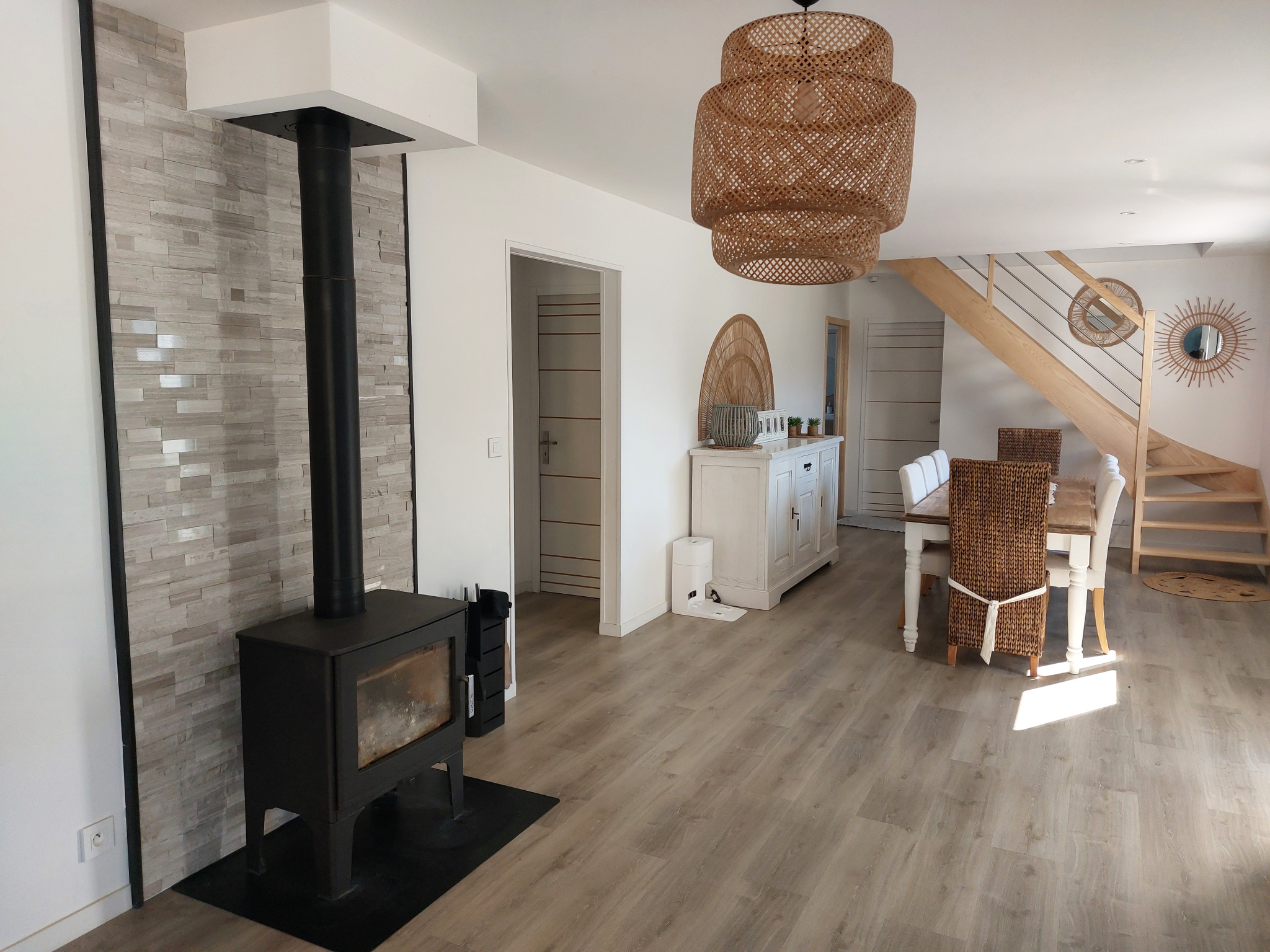 Dès l'entrée, vous serez séduit par un vaste espace de vie lumineux, agrémenté d'un poêle à bois pour une ambiance chaleureuse. La cuisine ouverte est entièrement équipée et aménagée (plaques de cuisson, hotte, four, micro-ondes, lave-vaisselle, îlot central) et le coin salon est cocooning.