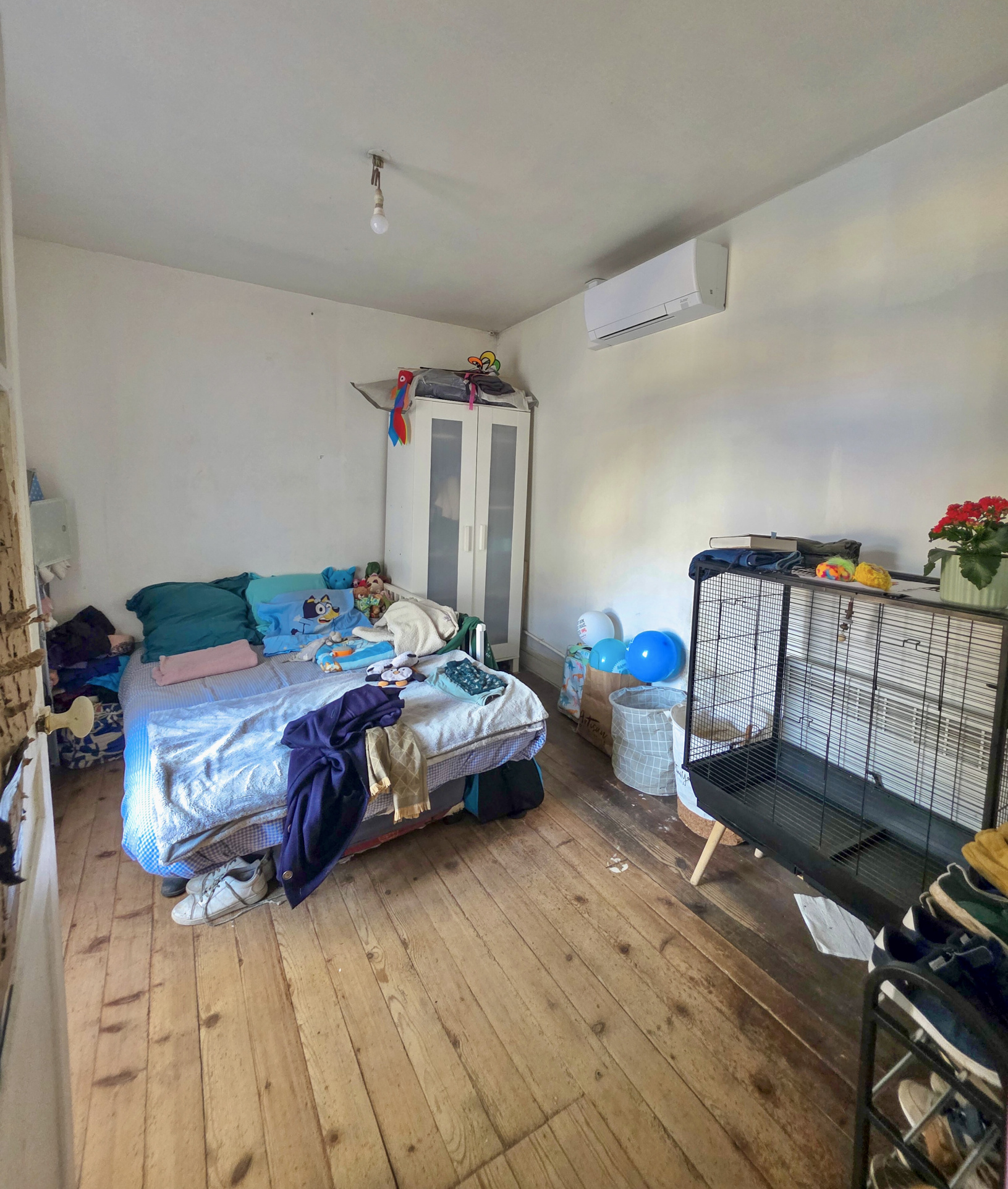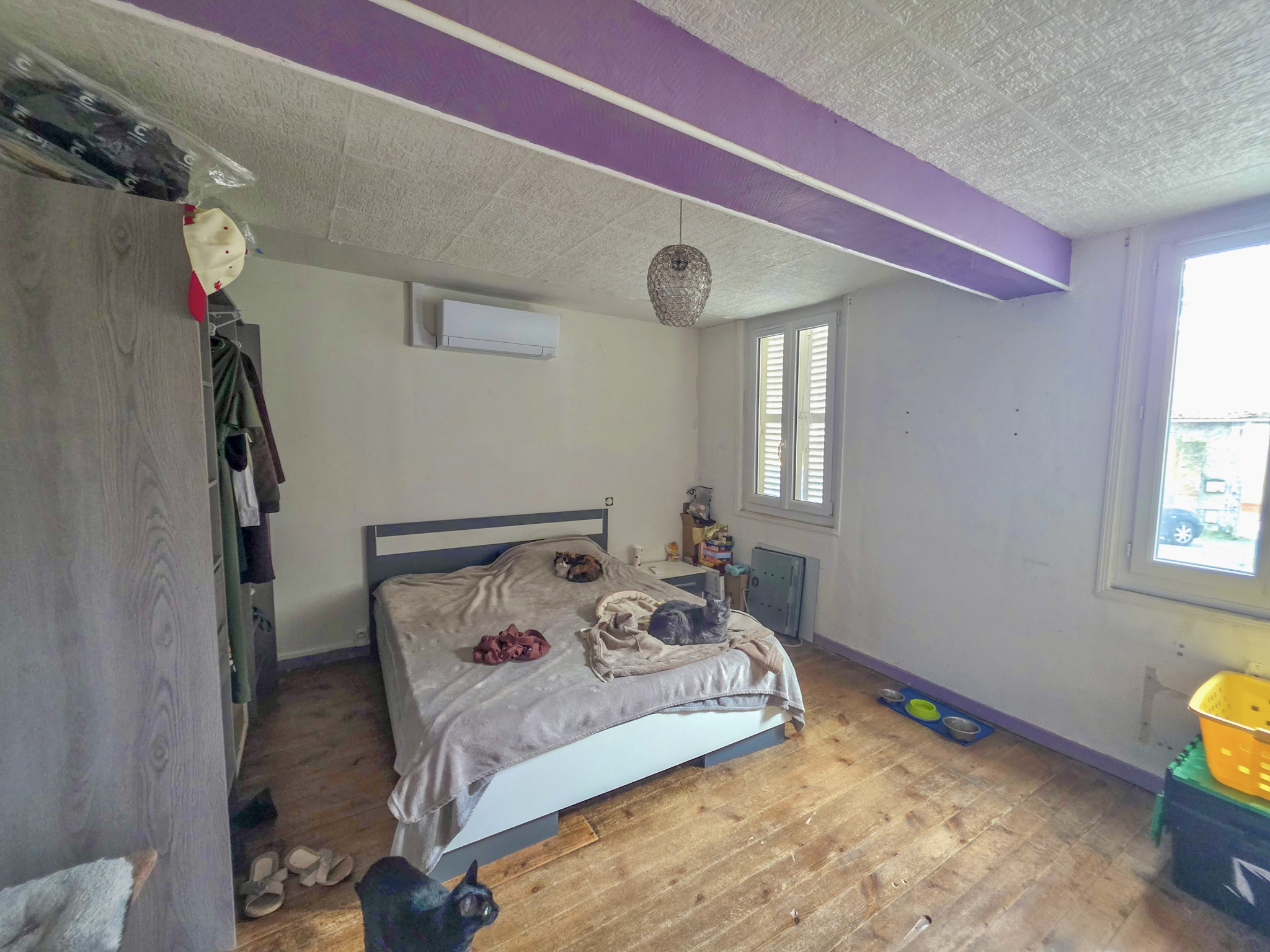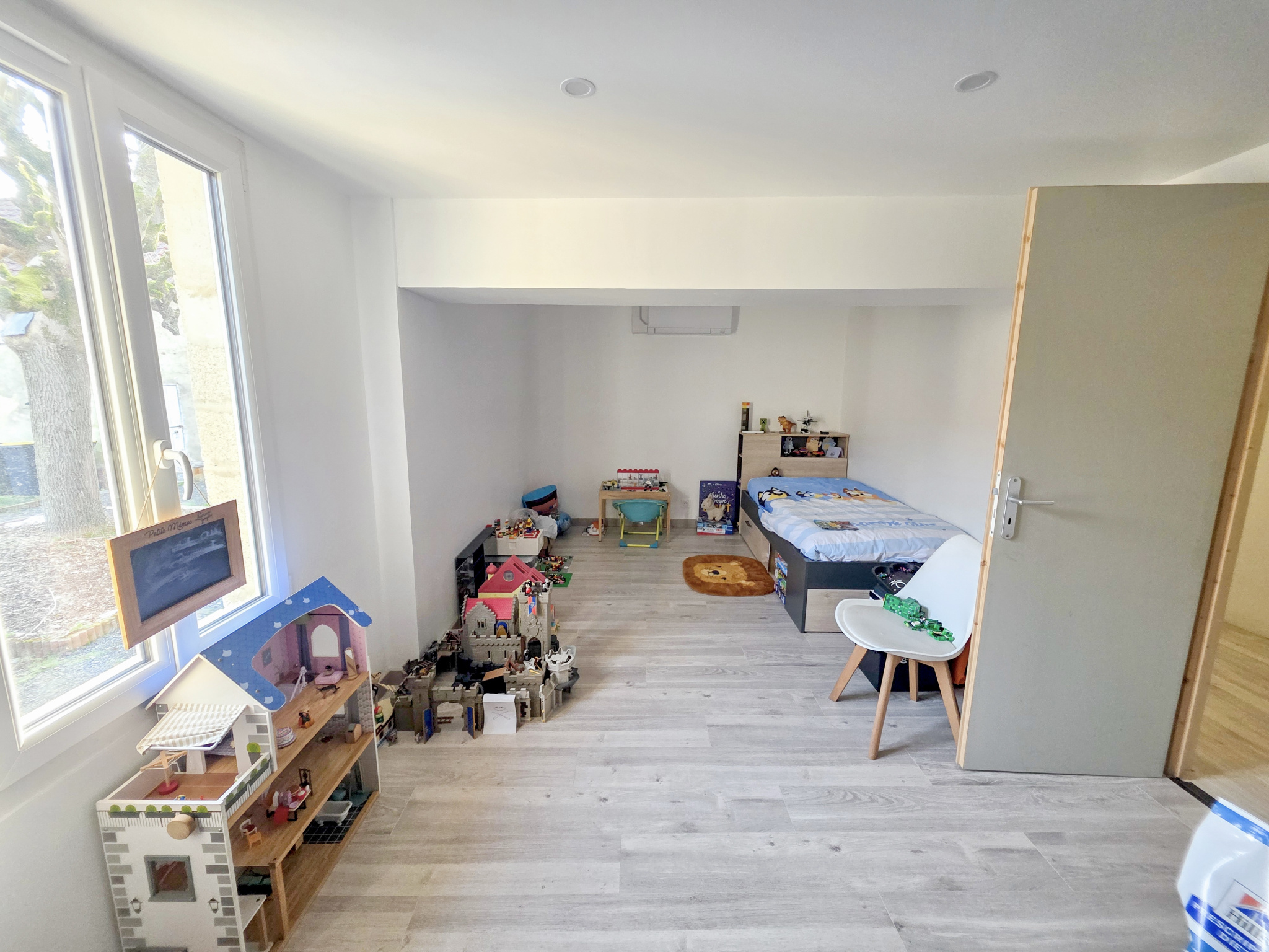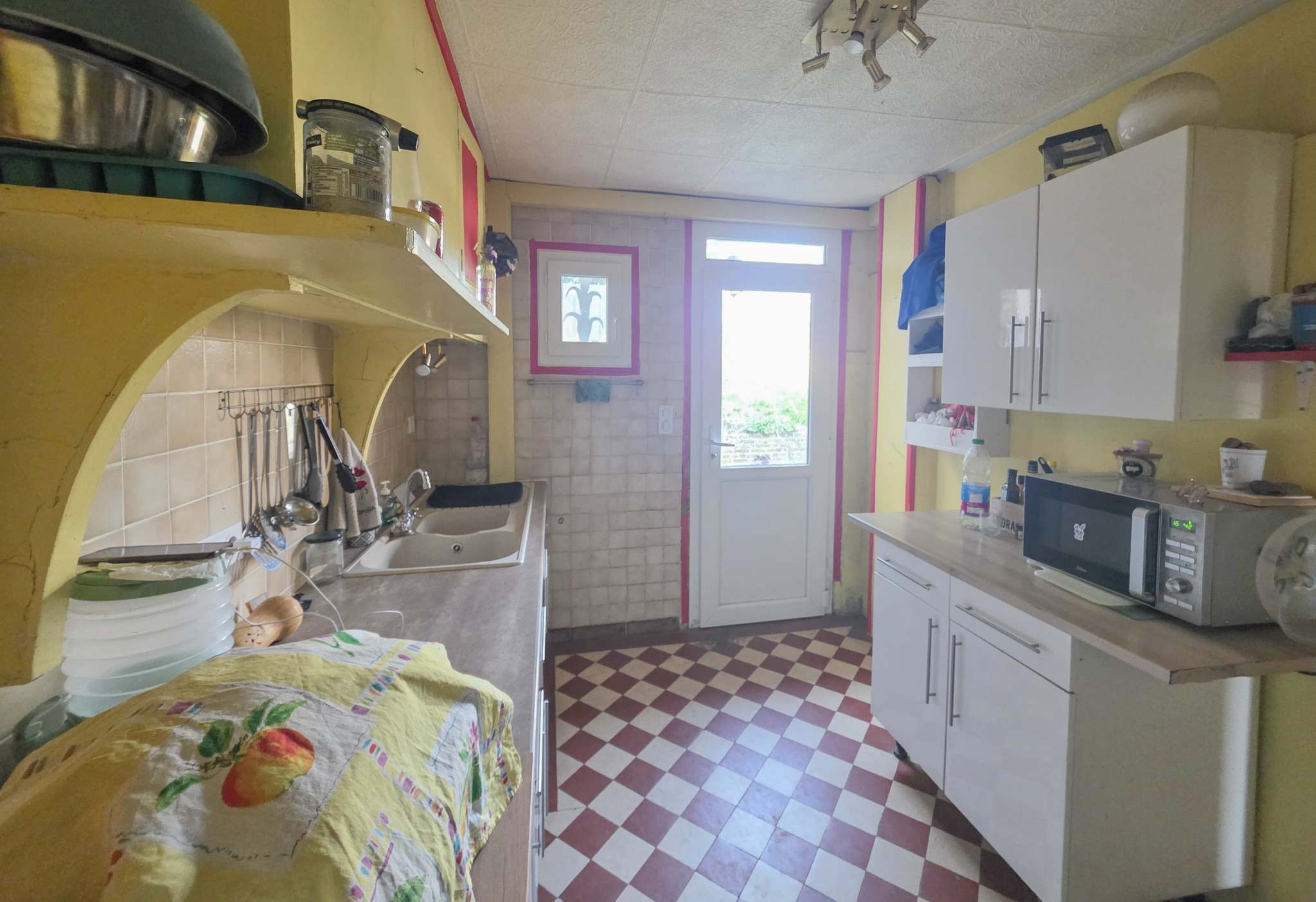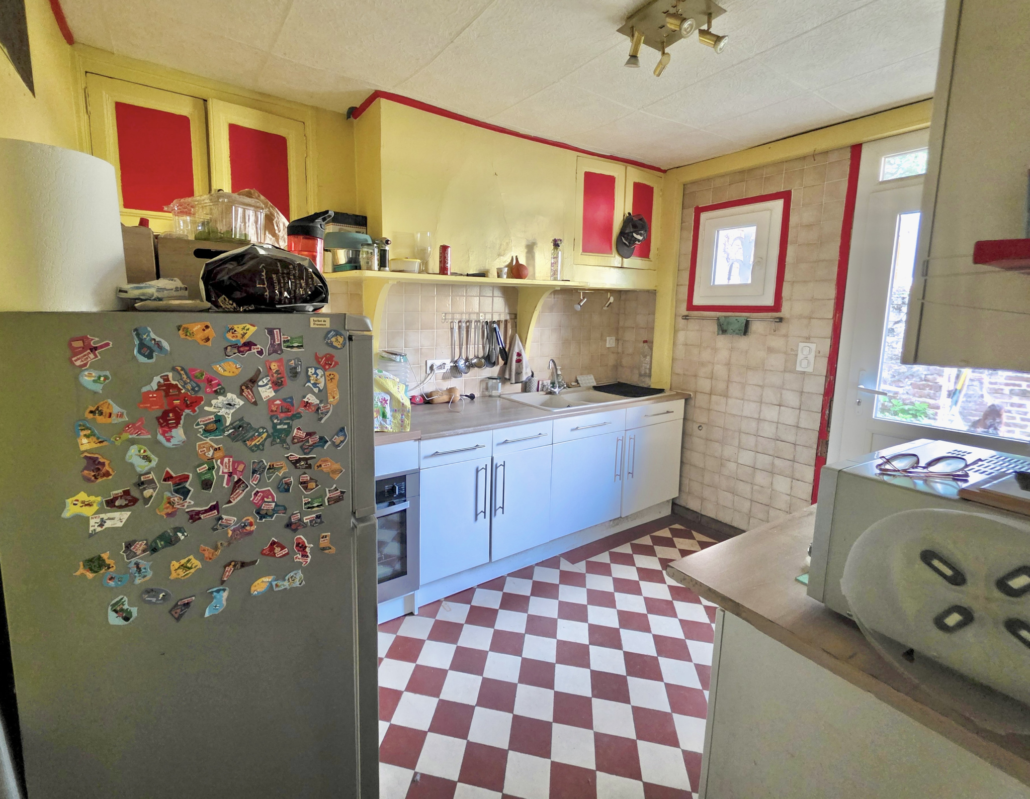 - une entrée, un salon avec poêle à bois, une cuisine aménagée, couloir desservant 4 chambres, une salle d'eau avec WC.