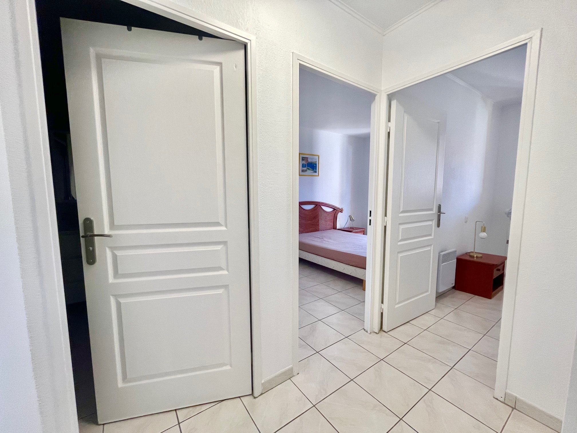 A 2 pas du centre-ville et de la mer - Dans un Parc résidentiel réputé avec piscine, Situé au 4ème et dernier étage, appartement 3 pièces de 48m2 comprenant une entrée, coin cuisine ouvert dans le séjour, 2 chambres, une salle d'eau, wc séparé. Vaste terrasse couverte de 21m2. Parking sécurisé en sous-sol.