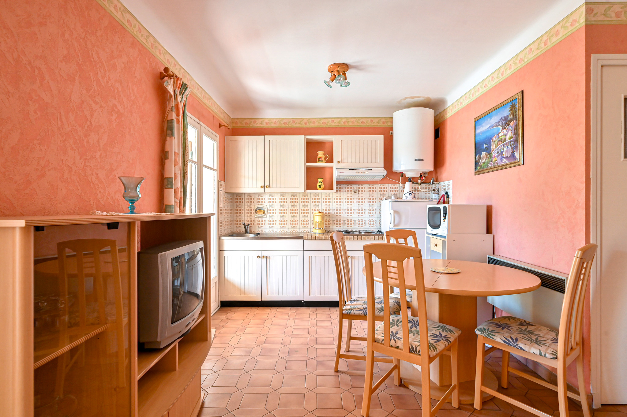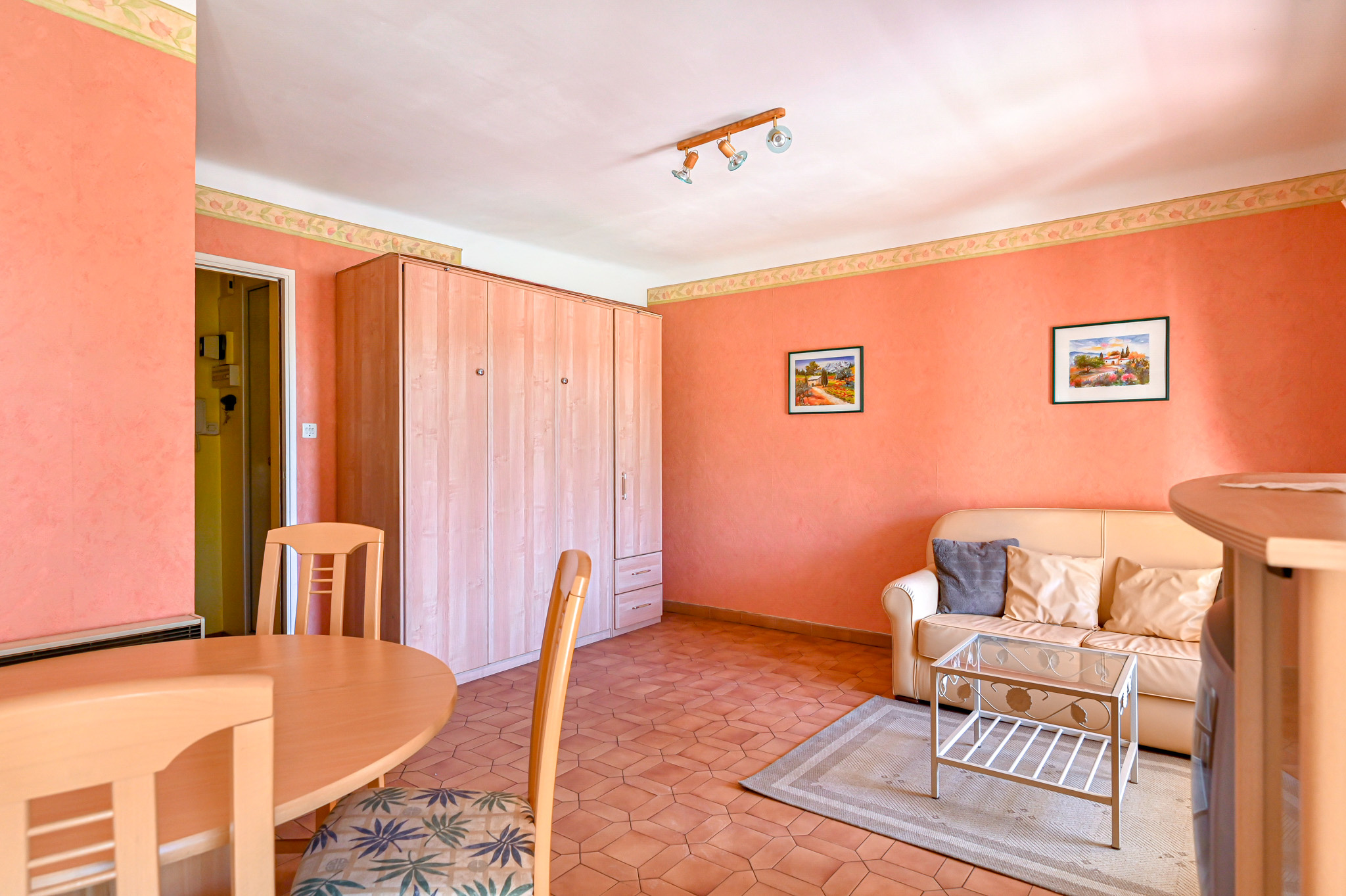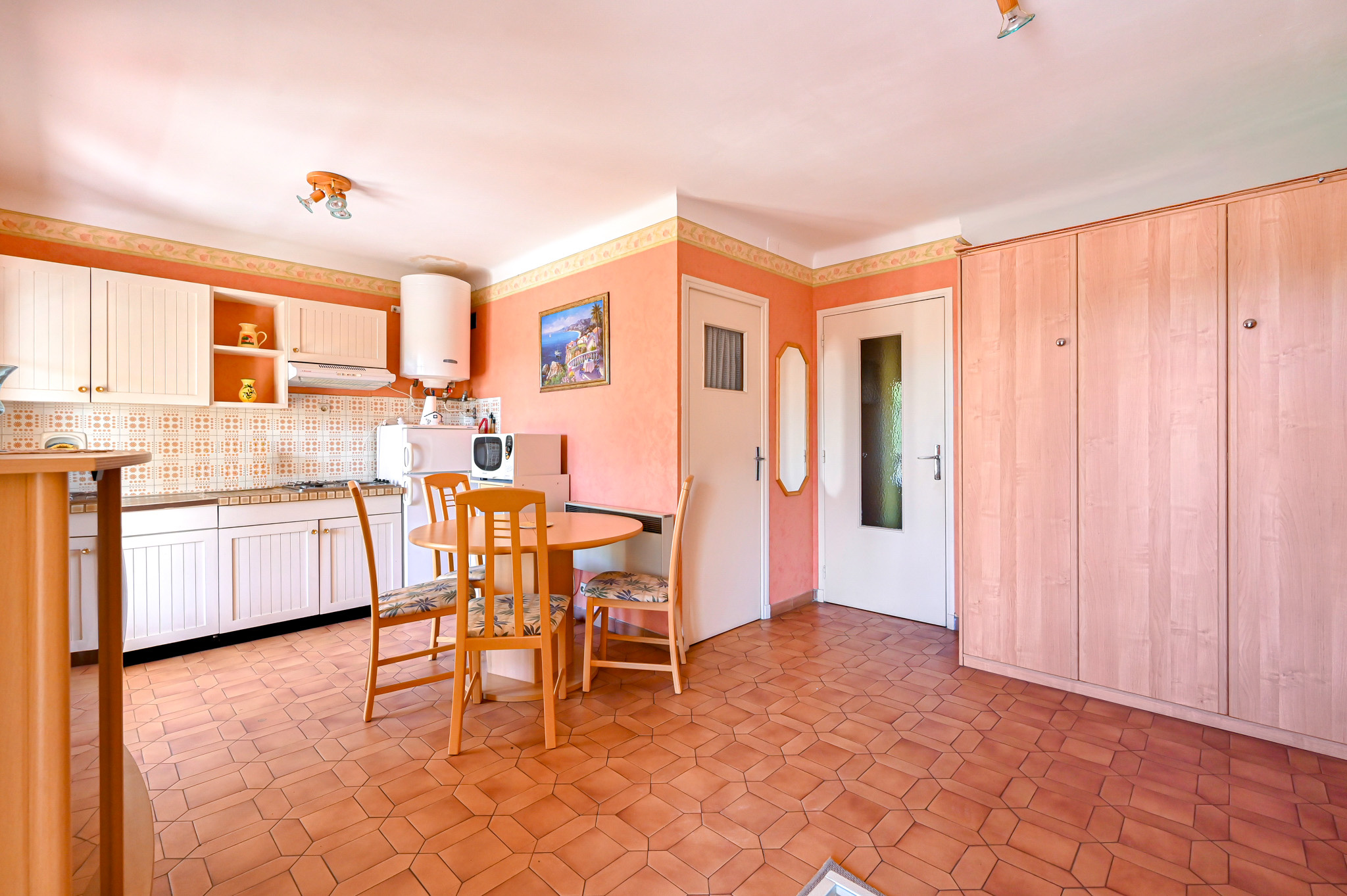 Appartement de type studio comprenant une piece principale avec coin cuisine donnant sur une terrasse .