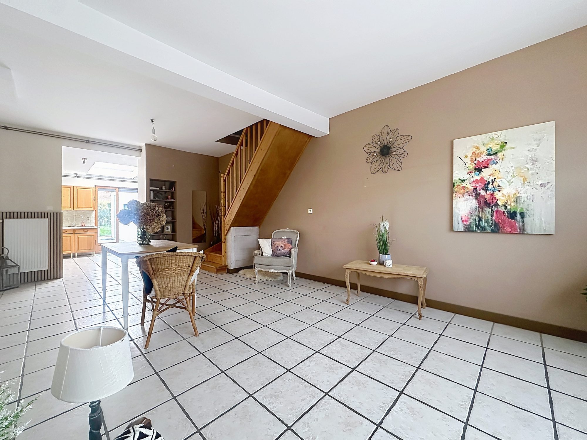 Celle-ci se compose au rez de chaussée d'un joli séjour donnant sur une cuisine équipée avec vue sur la terrasse et jardin exposés Sud.