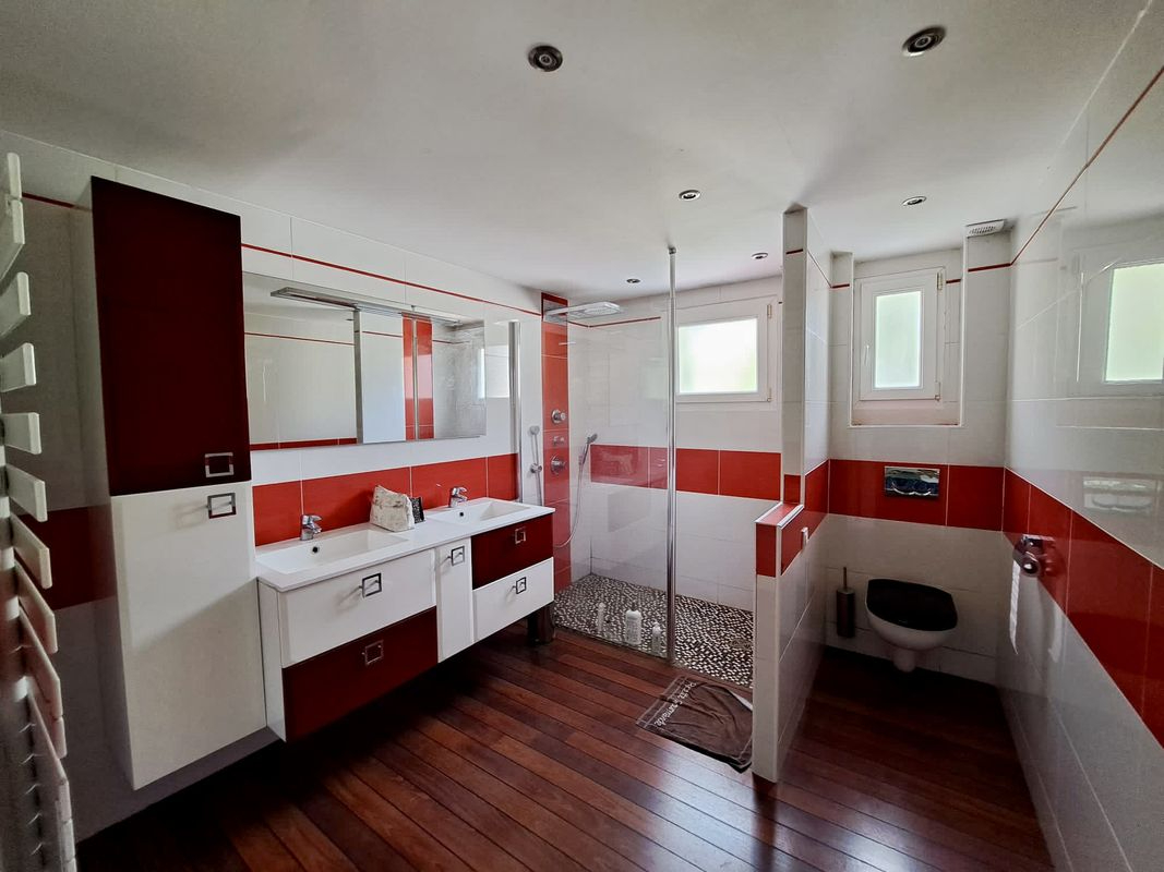 Un premier escalier depuis le garage dessert une pièce modulable selon vos besoins, ainsi qu'un espace bureau en mezzanine. Un second accès mène à une entrée accueillante avec poêle à granulés, ouvrant sur un double séjour lumineux, une cuisine aménagée avec piano de cuisson, une salle d'eau avec WC, une chambre et une vaste pièce traversante actuellement aménagée en chambre, donnant accès à une chambre avec dressing.