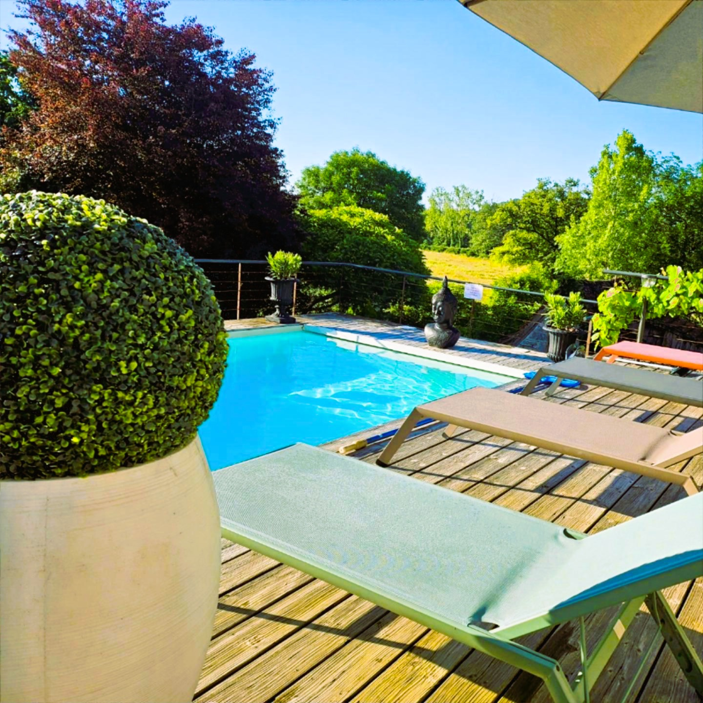 À l'arrière de la maison se trouve une vaste terrasse où vous et vos hôtes pourrez profiter de l'ombre d'un grand arbre. Un chemin en pente douce mène, en passant par le terrain de pétanque et le long des prairies, à un espace généreusement aménagé comprenant six hébergements insolites.
