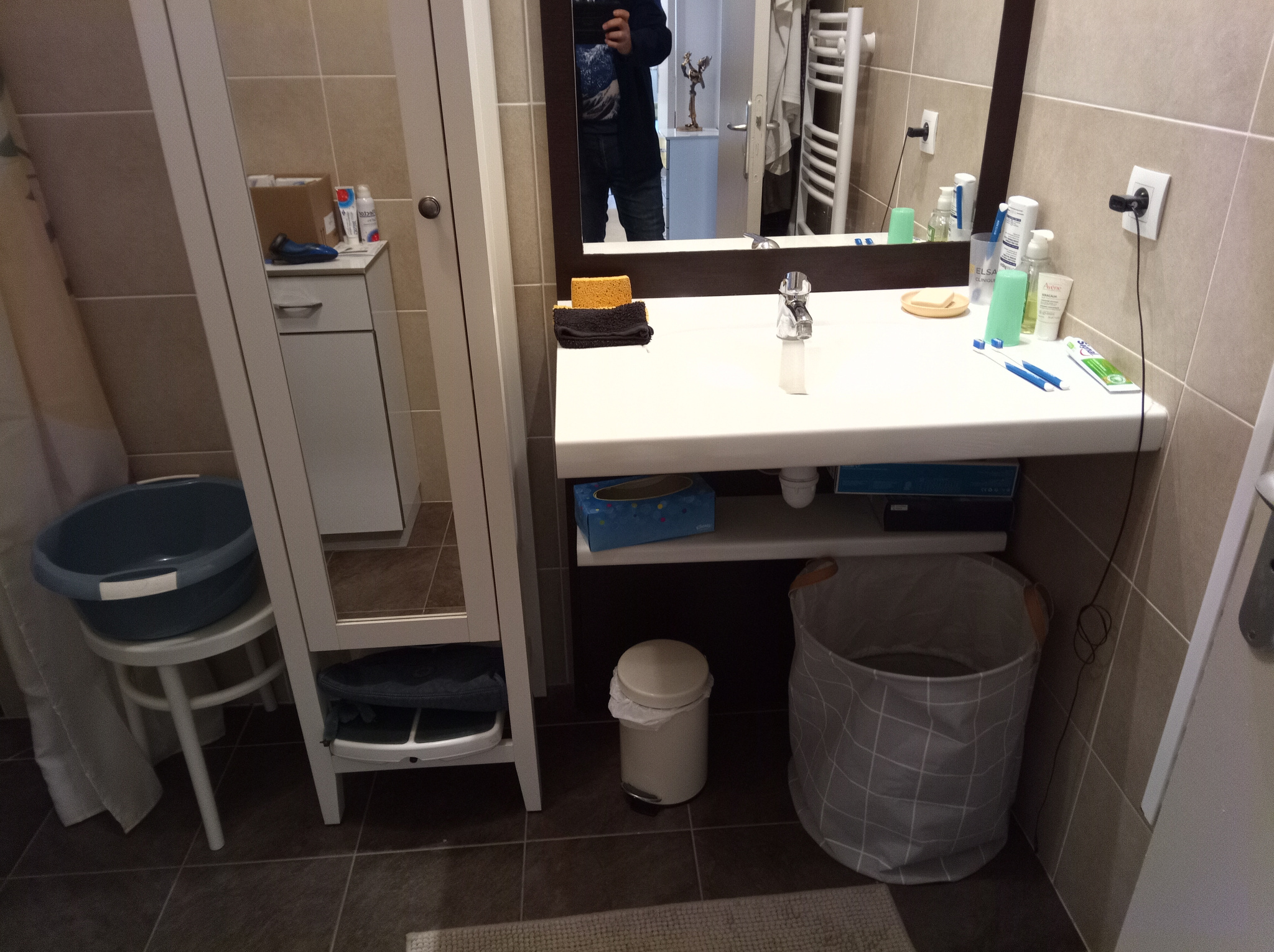 Salle d'eau adaptée : douche à l'italienne avec bac encastré, siège pliable, barre de maintien et sèche-serviettes