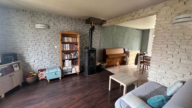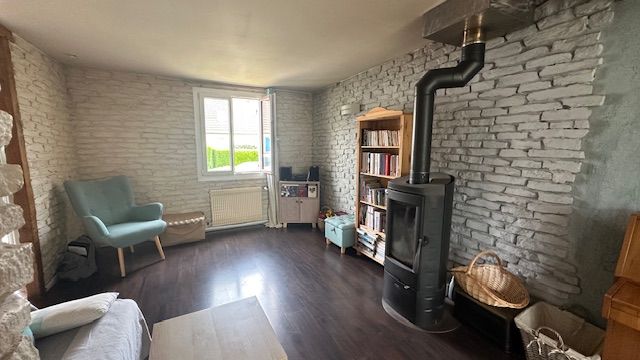 au rez de chaussée : une grande cuisine équipée ouverte sur un beau séjour,/salon avec poêle bois, une chambre et des toilettes .