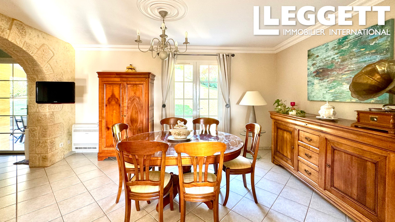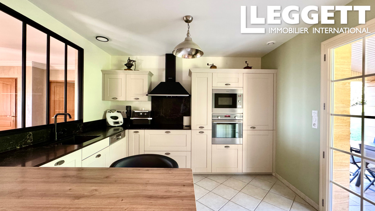 La cuisine fonctionnelle et conviviale, dispose également d'un accès de plain-pied à une terrasse couverte, idéale pour les repas en extérieur, ainsi qu'à la salle à manger adjacente.