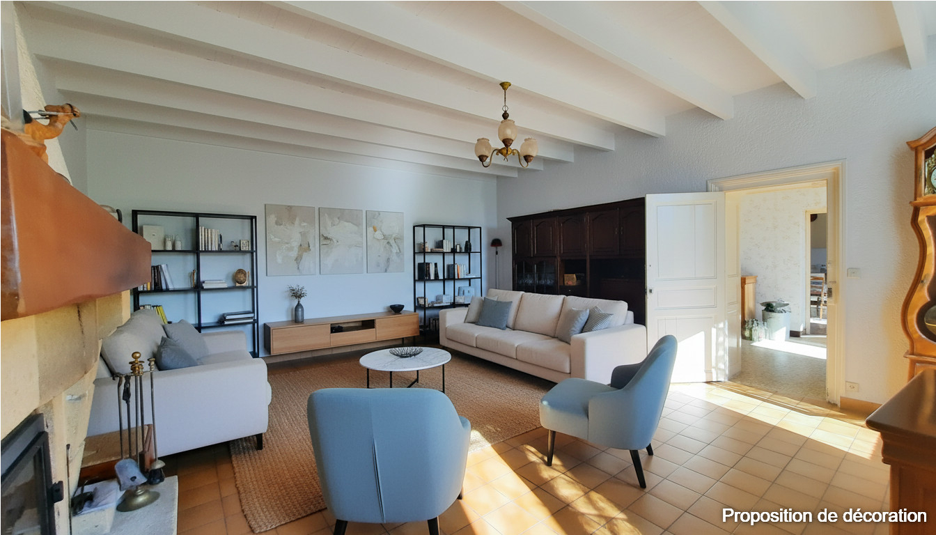 - Un vaste salon avec cheminée insert et poutres apparentes,