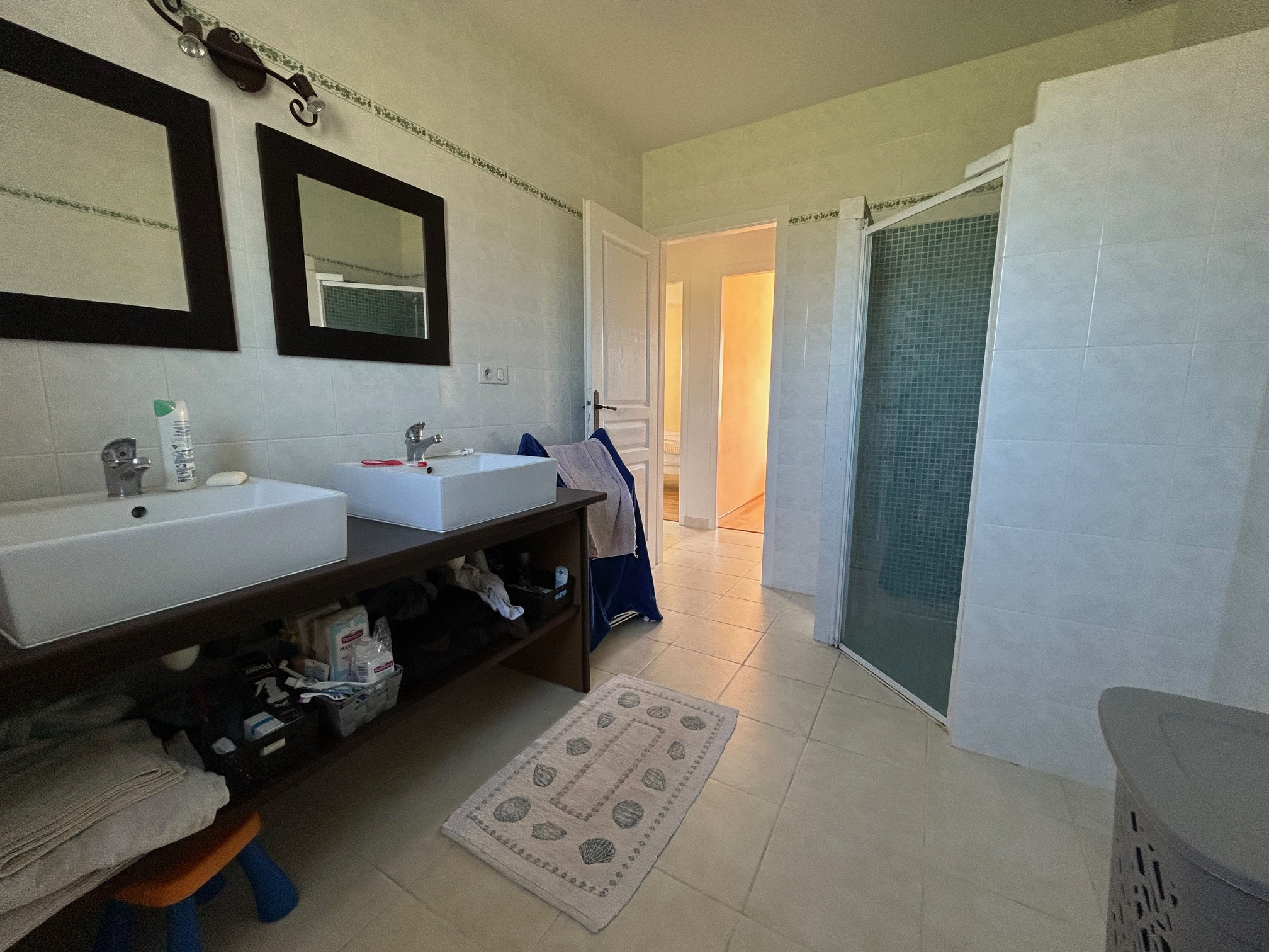 Elle comprend une cuisine ouverte sur la pièce de vie d'environ 55m2, 3 chambres, une salle d'eau et un wc. Un double garage d'environ 60m2 vient compléter le tout. Elle bénéficie d'une super isolation (classe B) avec double vitrage, chauffage au sol par géothermie, tout-à-l'égout.