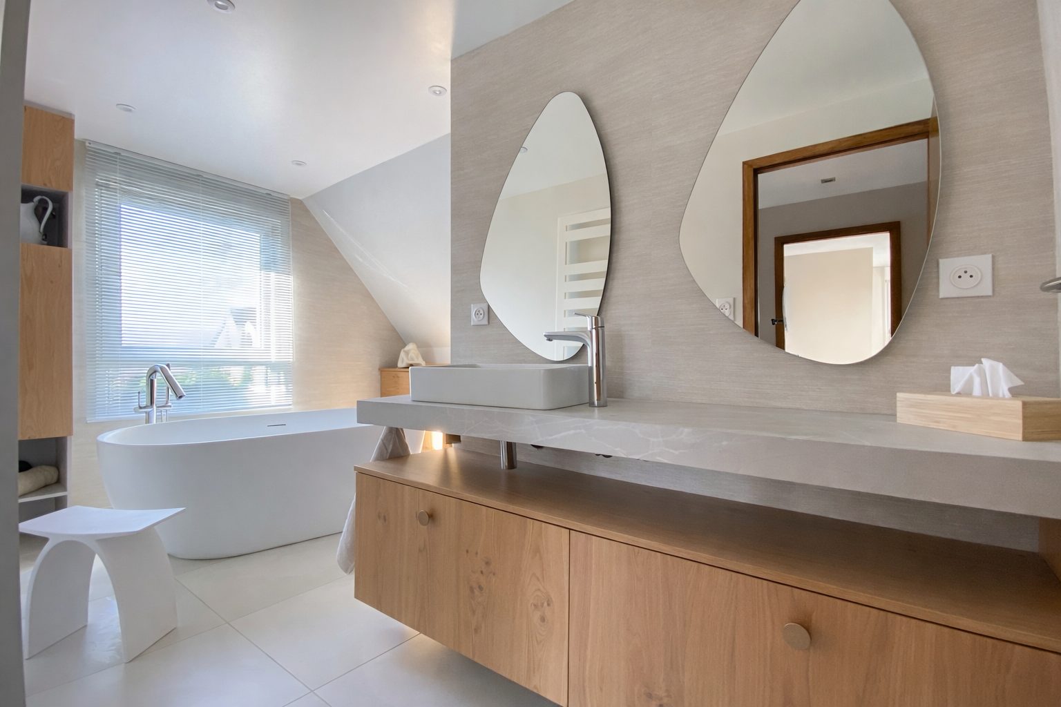 Vous profiterez d'une salle d'eau et d'une élégante salle de bains avec baignoire en ilot et douche.