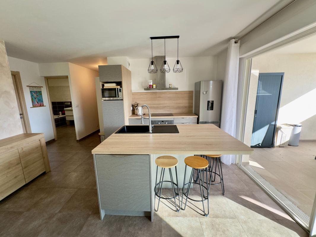 Dès l'entrée, vous serez séduit par la luminosité d'une vaste pièce à vivre s'ouvrant sur une cuisine américaine contemporaine, entièrement équipée avec des matériaux de qualité, un îlot central convivial et de l'électroménager intégré.