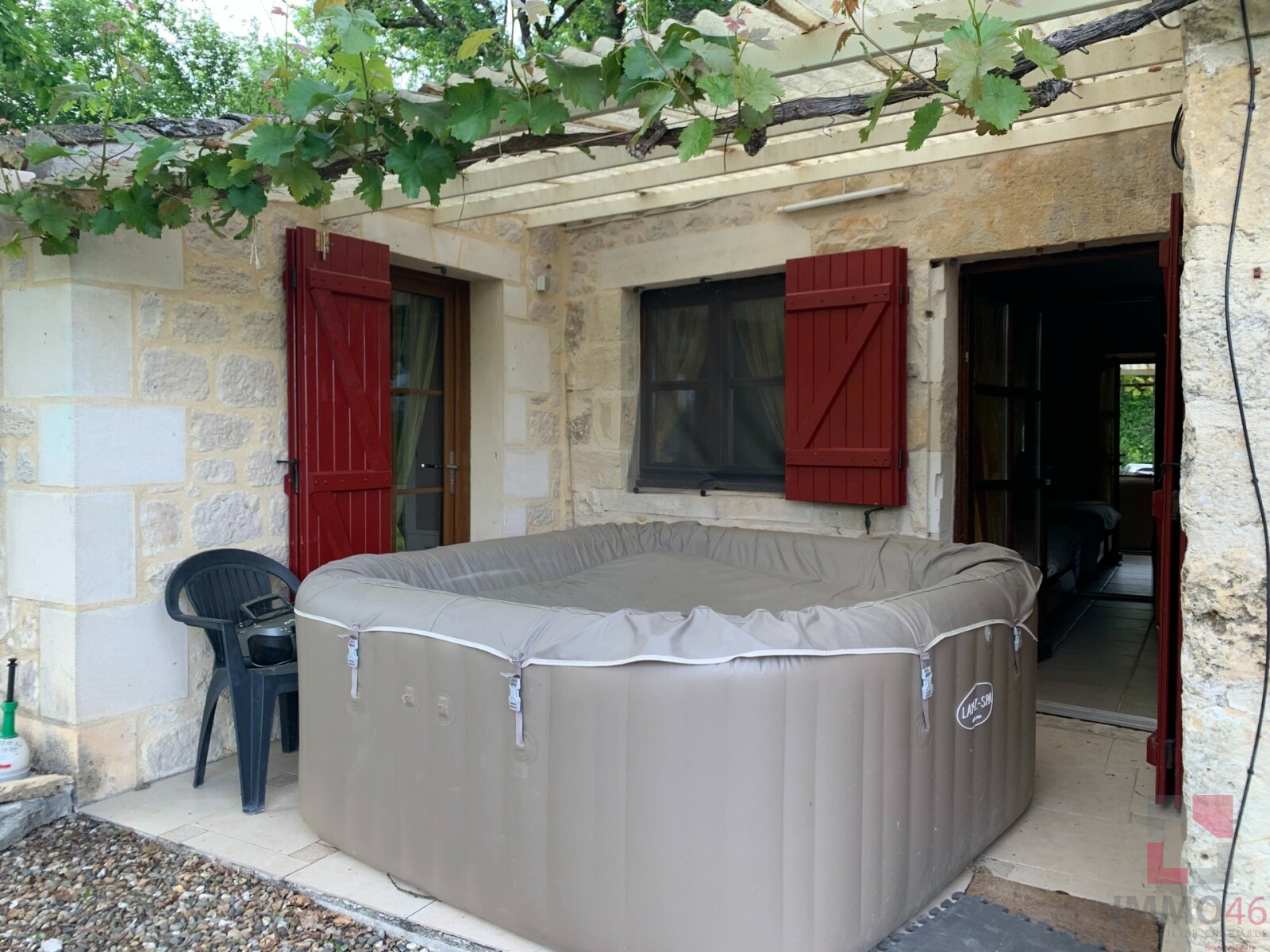 L?extérieur vous offre une terrasse avec pergola exposée sud-est, une piscine hors sol, un jacuzzi et un chalet de jardin.