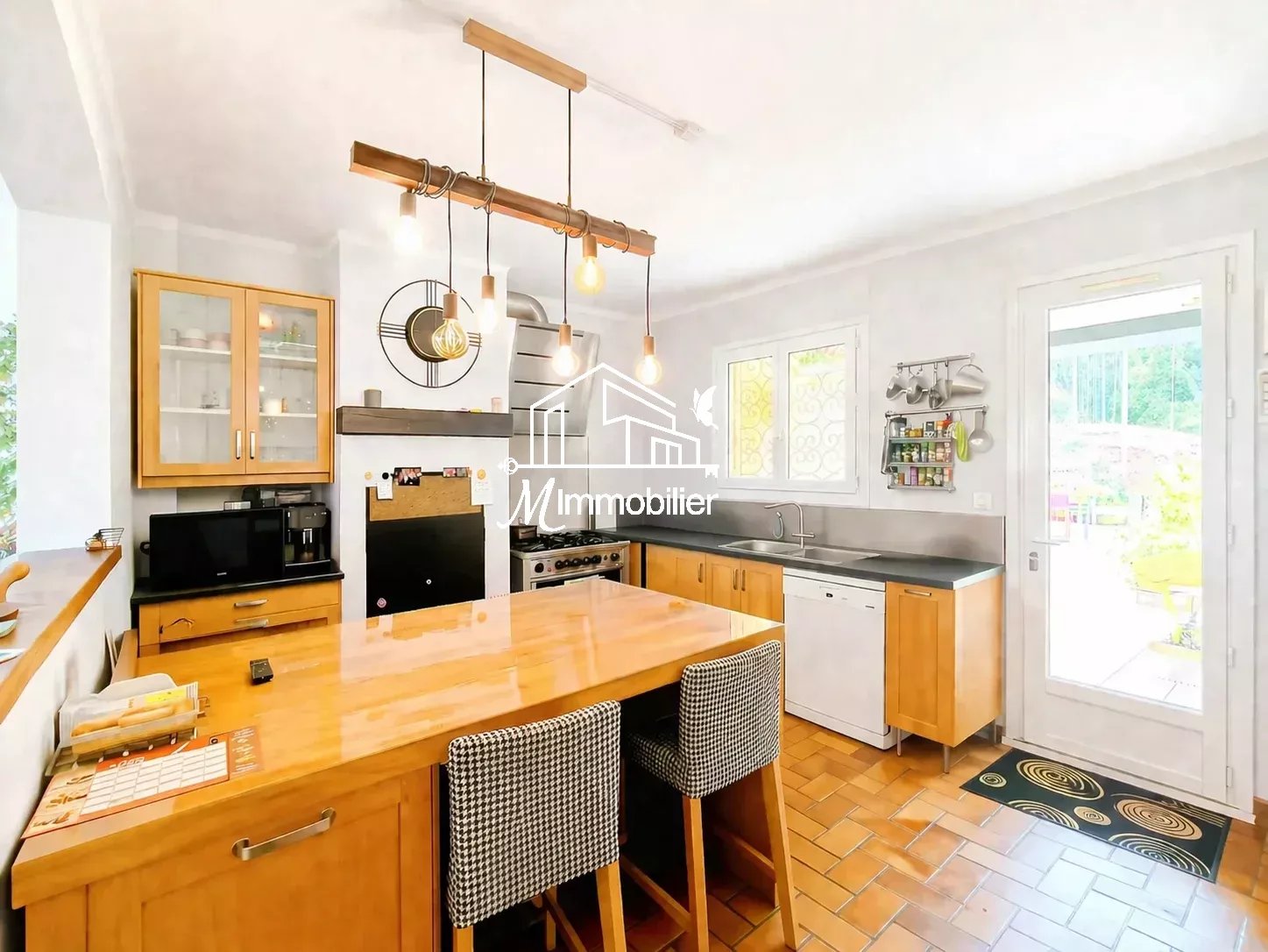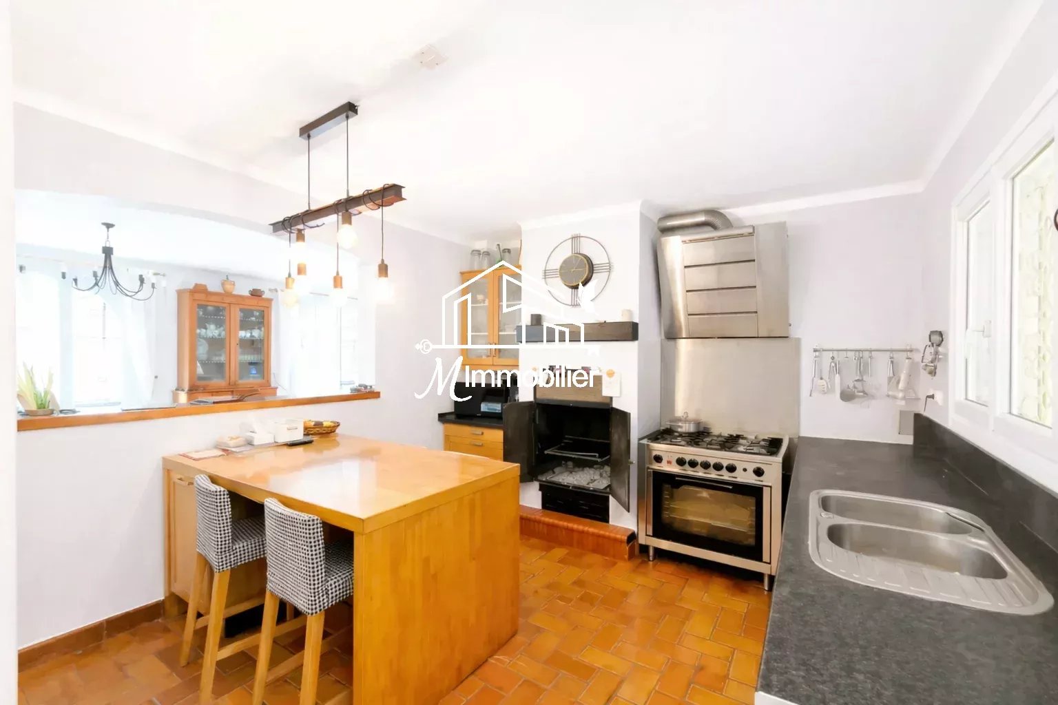 Cuisine équipée semi-ouverte avec îlot central et barbecue intérieur donnant accès à la terrasse avec pergola bioclimatique.