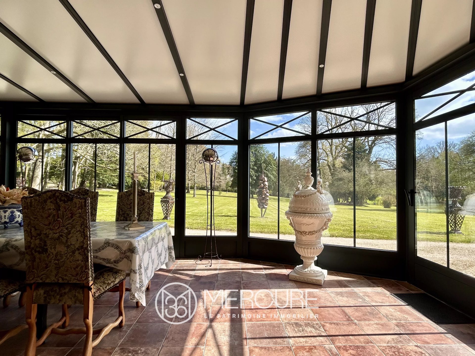 Côté jardin, une magnifique véranda haut de gamme d’environ 32 m² permet de profiter pleinement d’une vue dégagée sur la nature environnante.
