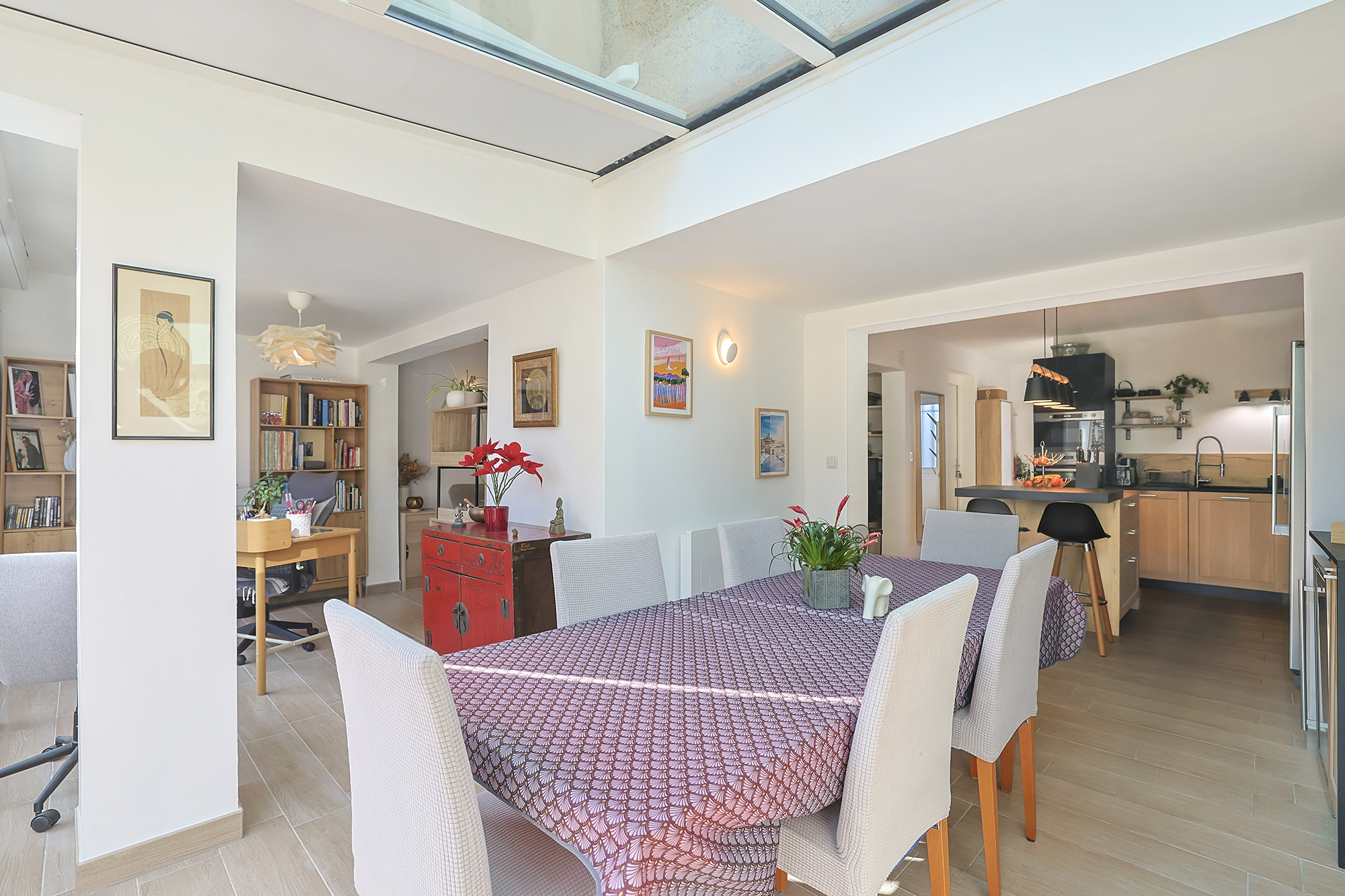 Au rez-de-chaussée, l'entrée dessert un vaste séjour salon avec cuisine ouverte de 46 m2, agencé avec goût. Un espace bureau harmonieusement intégré offre une vue directe sur le jardin.