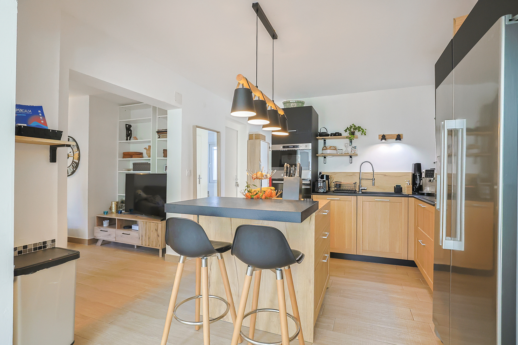 La cuisine américaine de marque HARMONY avec îlot central est entièrement équipée avec un électroménager de qualité.