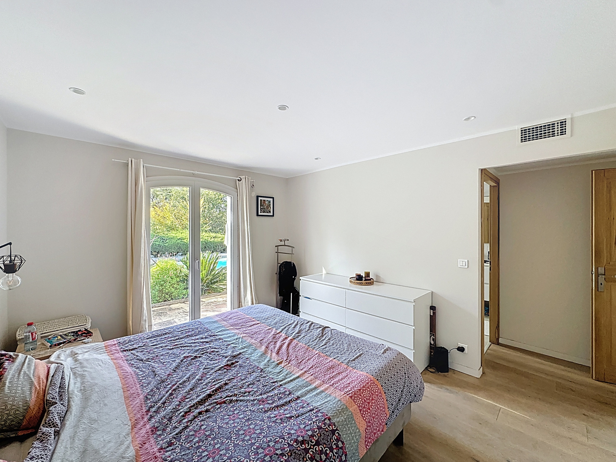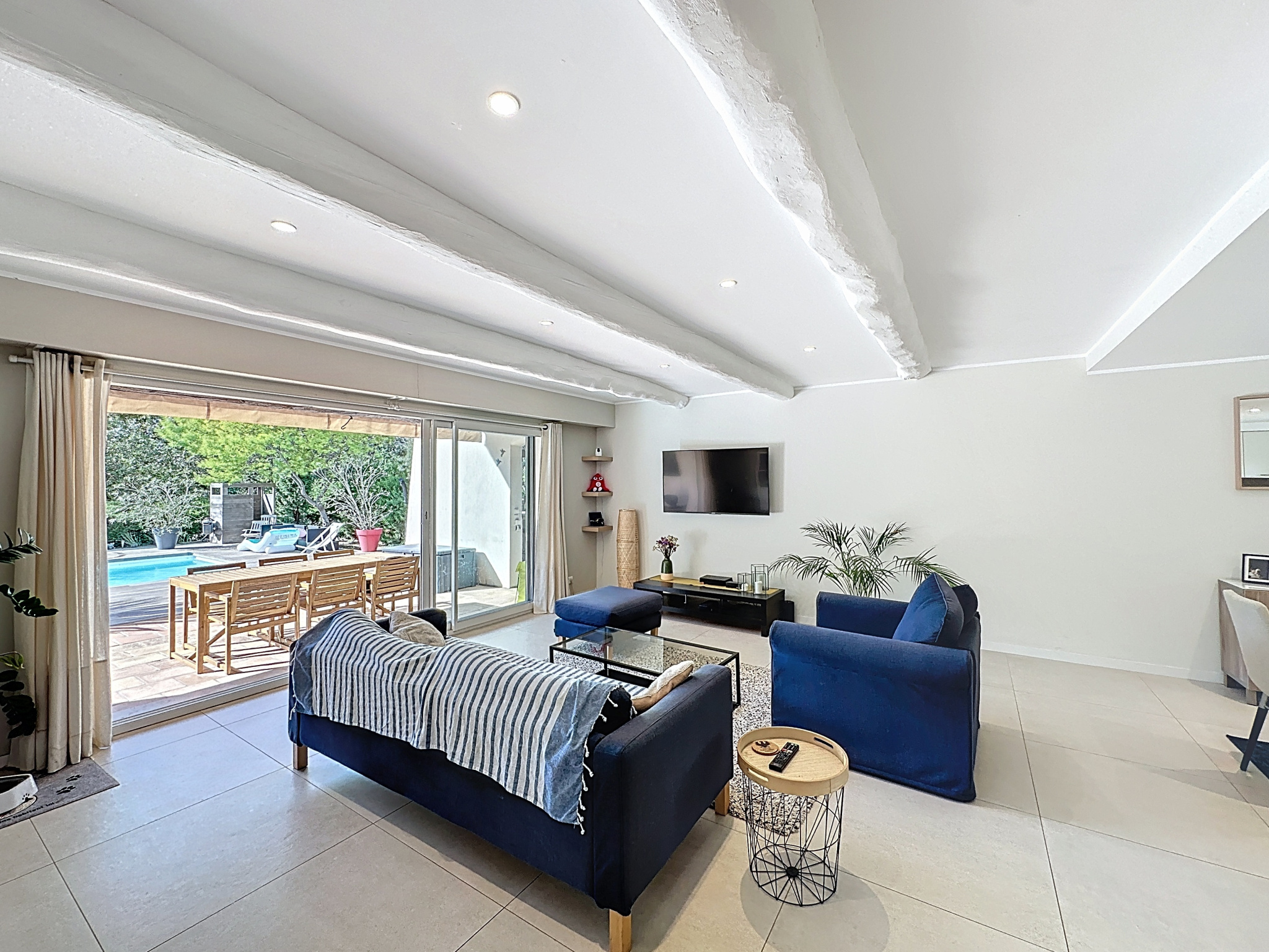 L'extérieur séduit immédiatement : un grand terrain plat agrémenté d'une belle piscine entourée de terrasses en teck, d'un espace barbecue et plancha, et d'un jardin parfaitement aménagé, offrant un cadre idéal pour profiter pleinement du mode de vie azuréen.