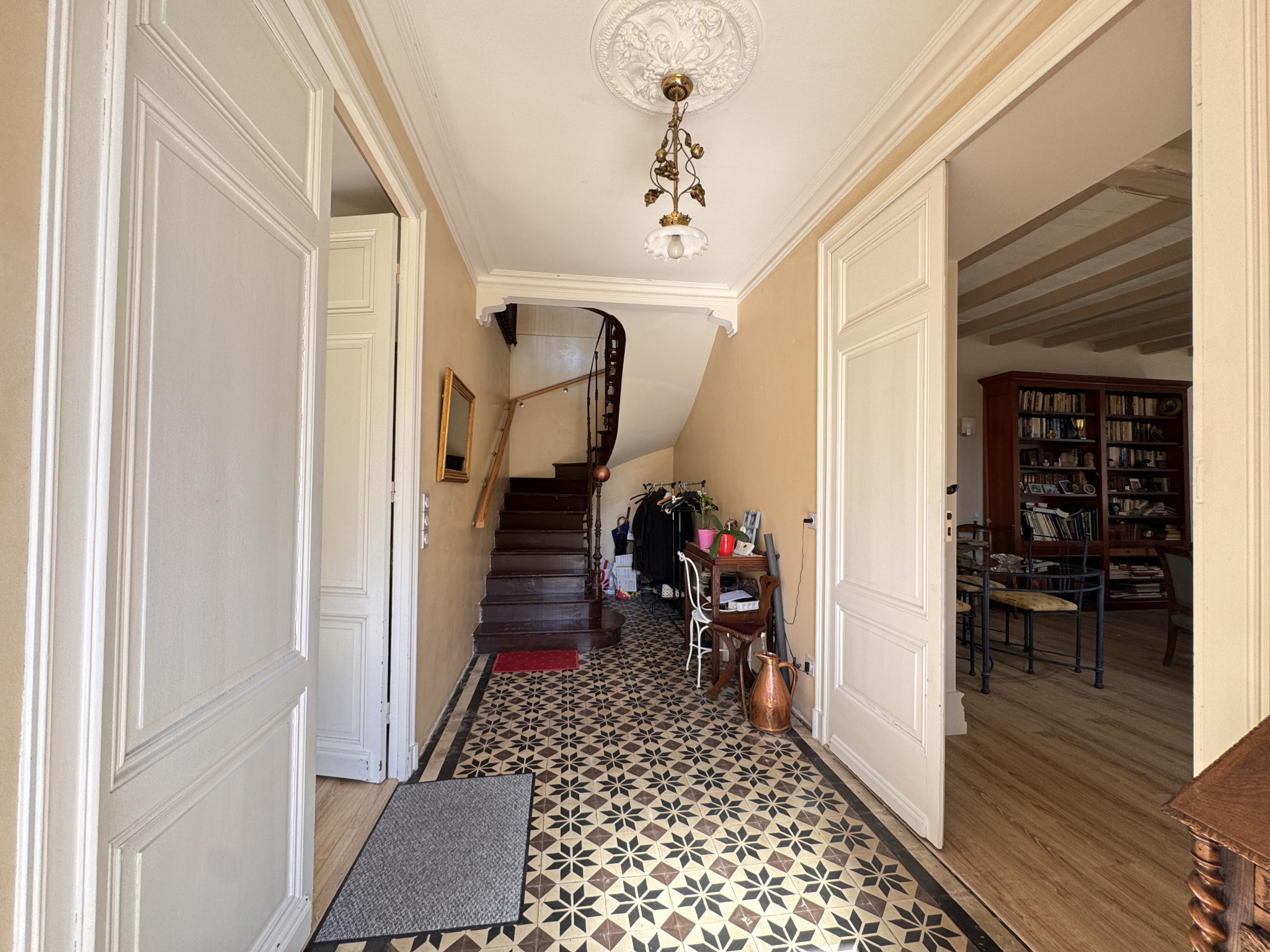 MONTGUYON (17) En plein centre-ville, à deux pas des commerces et services, cette belle demeure développe environ 178 m2 habitables sur une parcelle de 247 m2. Lumineuse et chaleureuse, elle offre des volumes confortables adaptés à une vie de famille. L'entrée distribue un vaste séjour baigné de lumière grâce à ses quatre ouvertures, une salle à manger avec accès sur l'extérieur, cuisine équipée en enfilade complétée par arrière-cuisine/buanderie et garage. À l'étage, un large palier avec rangements constitue un véritable espace de vie supplémentaire. Il dessert trois chambres, une belle salle de bains avec wc et un grenier exploitable. Menuiseries PVC double vitrage. Chauffage par pompe à chaleur avec climatisation réversible La rénovation soignée et respectueuse séduira les amoureux d'authenticité. Accès N10 proche pour Bordeaux et Barbezieux.