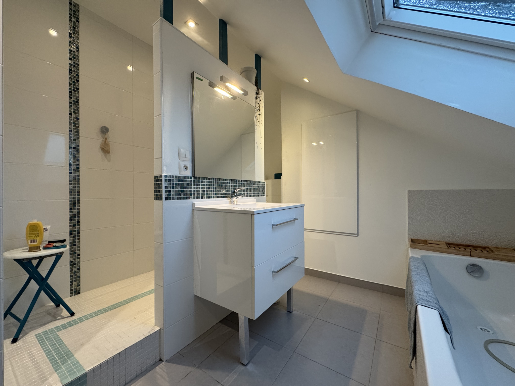 À l'étage, vous découvrirez un espace bureau, trois chambres supplémentaires et une salle de bains avec douche, baignoire et WC.