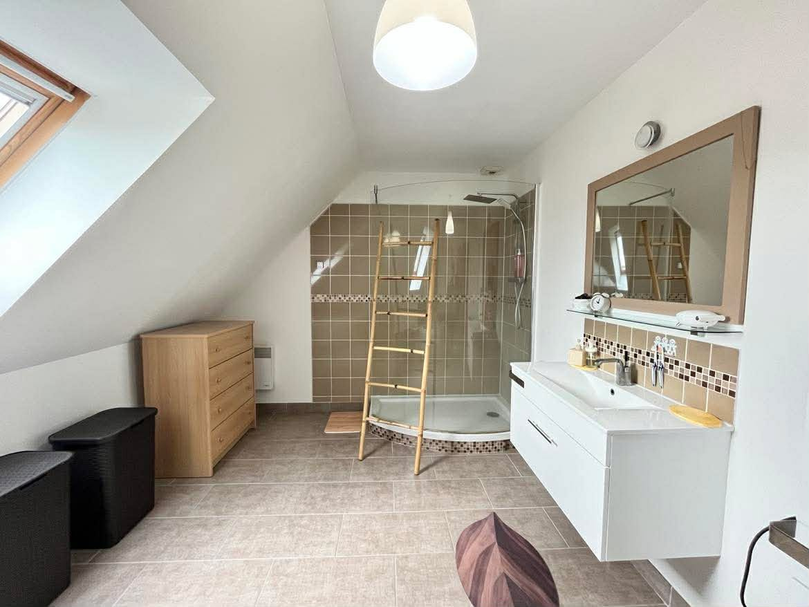 À l'étage, un palier dessert 3 belles chambres, dont une avec un dressing indépendant, ainsi qu'une grande salle de bain avec baignoire et douche puis un second WC indépendant.