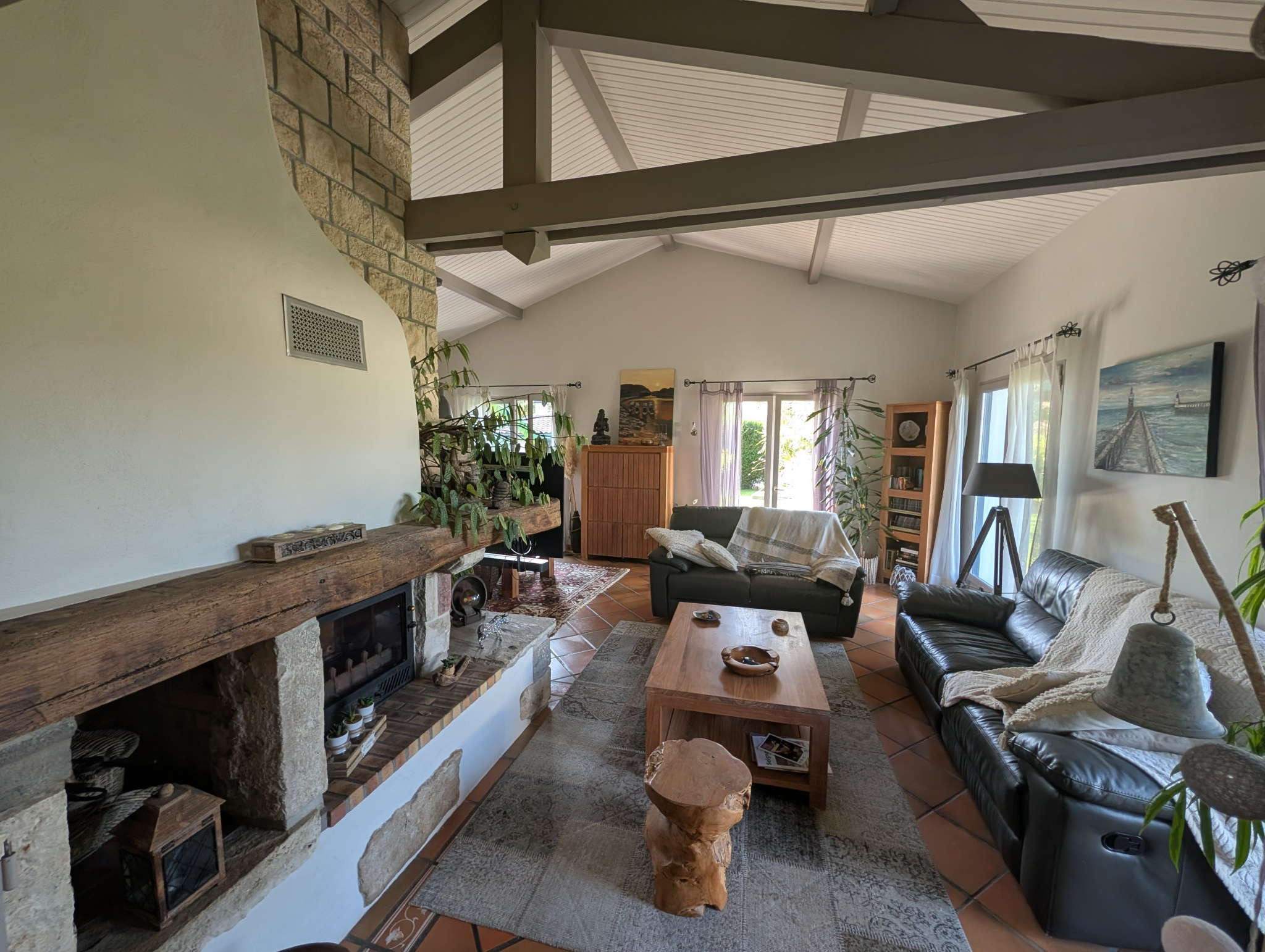 - Au rez de chaussée : une entrée, un vaste séjour lumineux avec cuisine ouverte et insert de plus de 50 m2 (donnant accès à la terrasse, au jardin et à une bodega de 20 m2 avec cuisine d'été), et un coin nuit composé de 3 chambres, une salle d'eau, un WC.