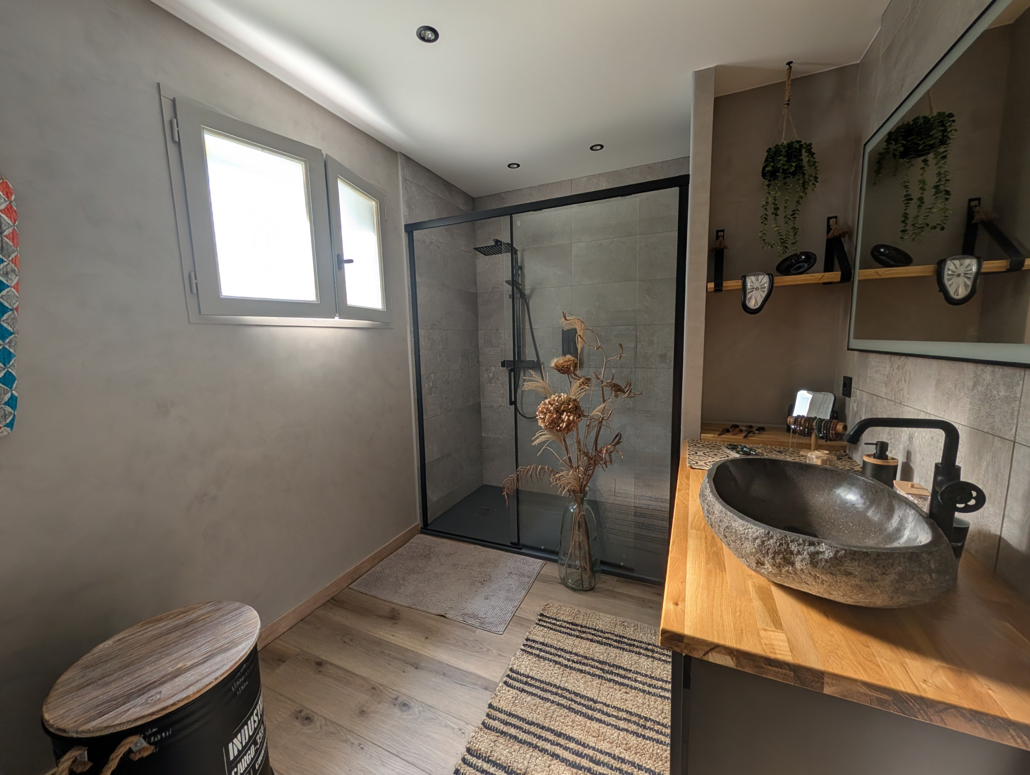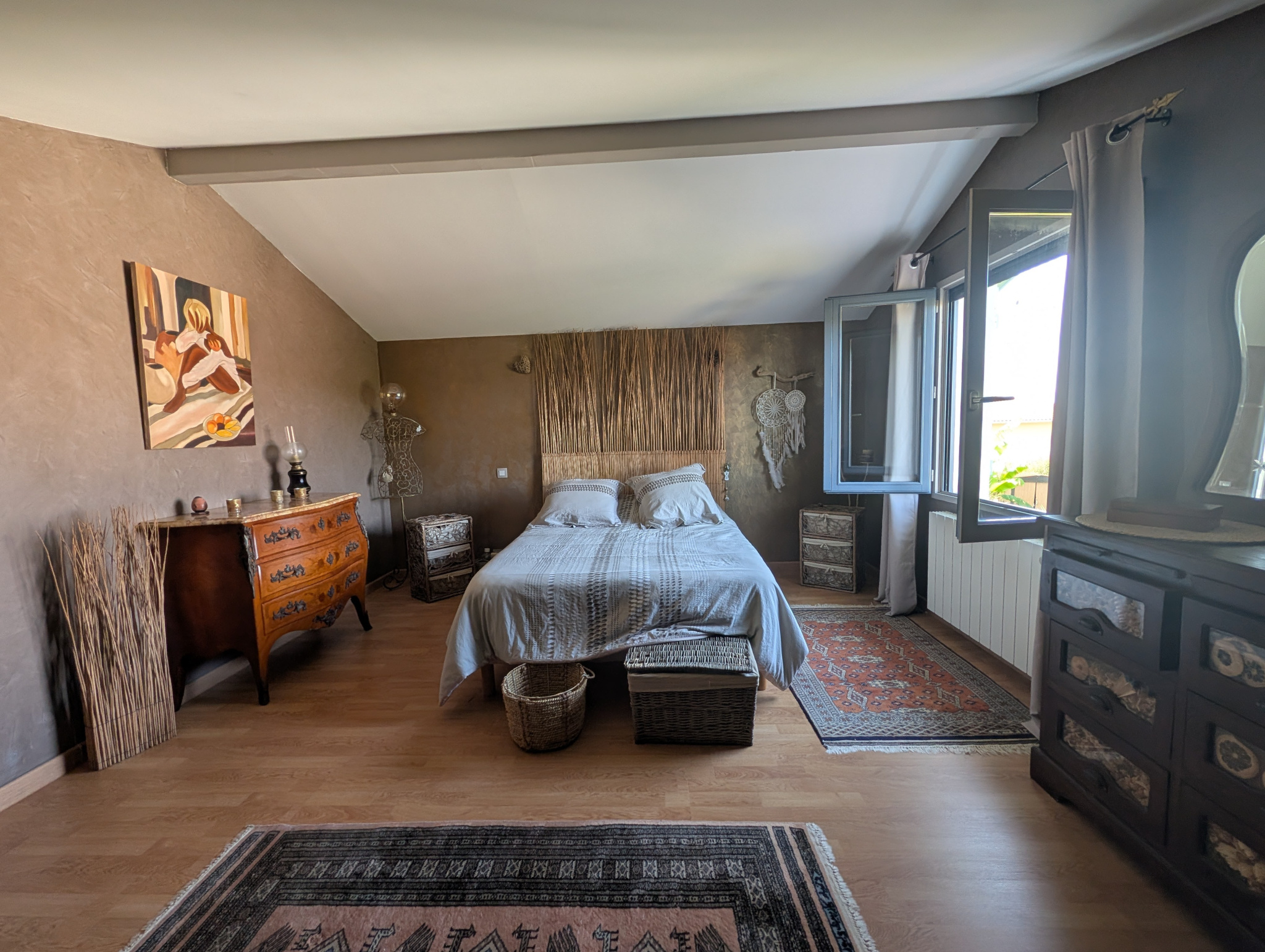 - A l'étage : une grande chambre de plus de 25 m2 avec salle de bain et douche, WC, dressing.