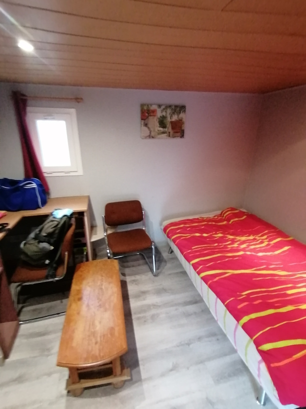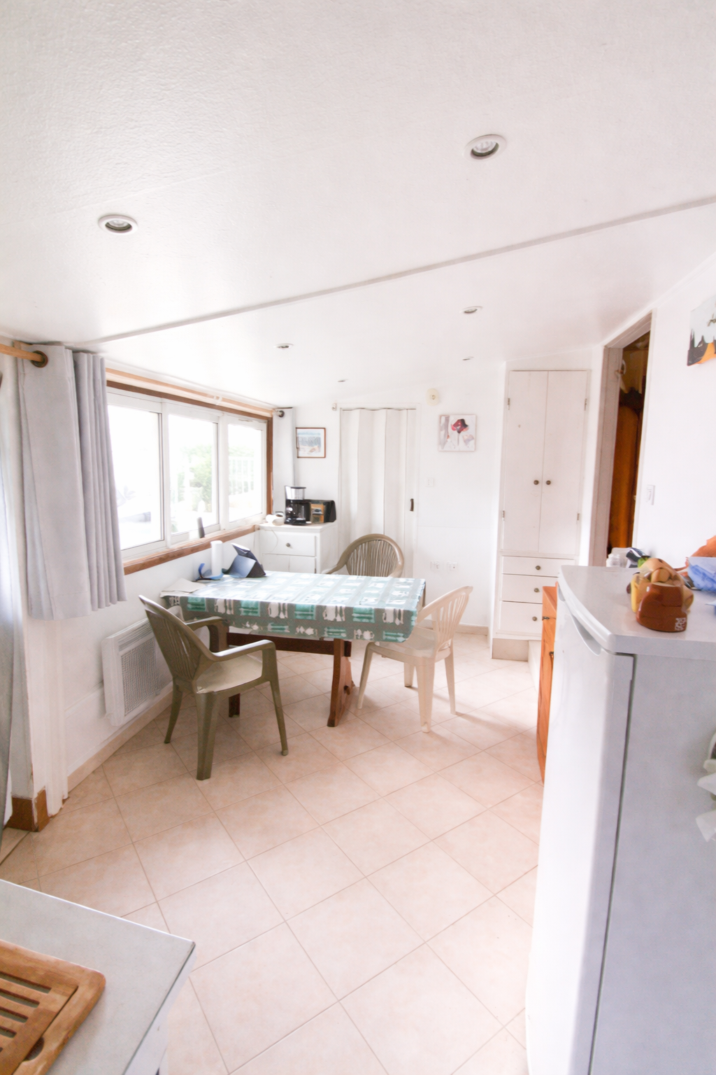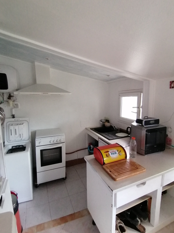 Chalet avec 2 chambres, séjour et cuisine ouverte,coin salon, salle d'eau avec vasque et douche, WC séparé
