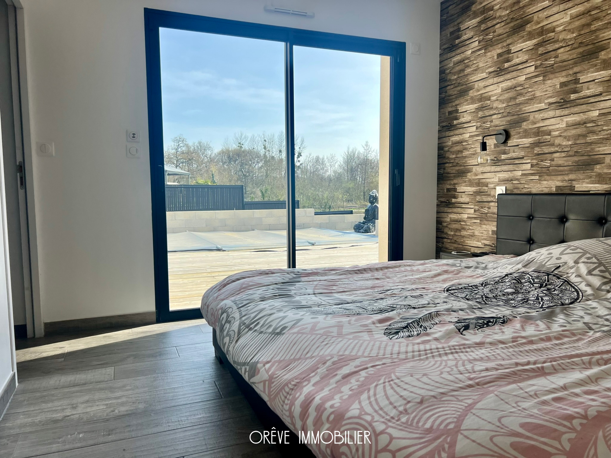 La suite parentale principale dévoile un espace dressing, une salle de bains, un WC séparé, et une chambre ouverte sur la terrasse, offrant un accès direct à la piscine.