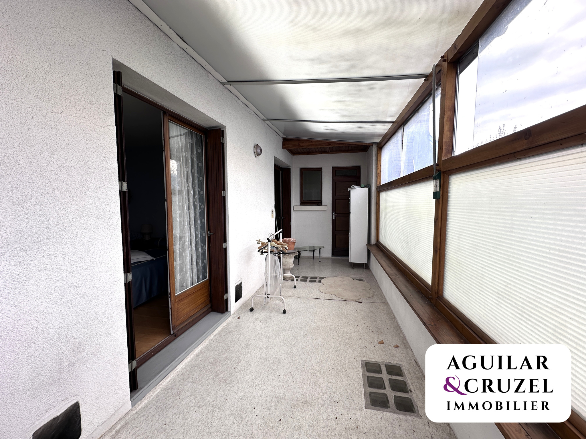- à droite, un couloir distribuant deux chambres supplémentaires et un WC. Une véranda permet également l'accès à une cinquième chambre ainsi qu'à une salle d'eau avec WC.