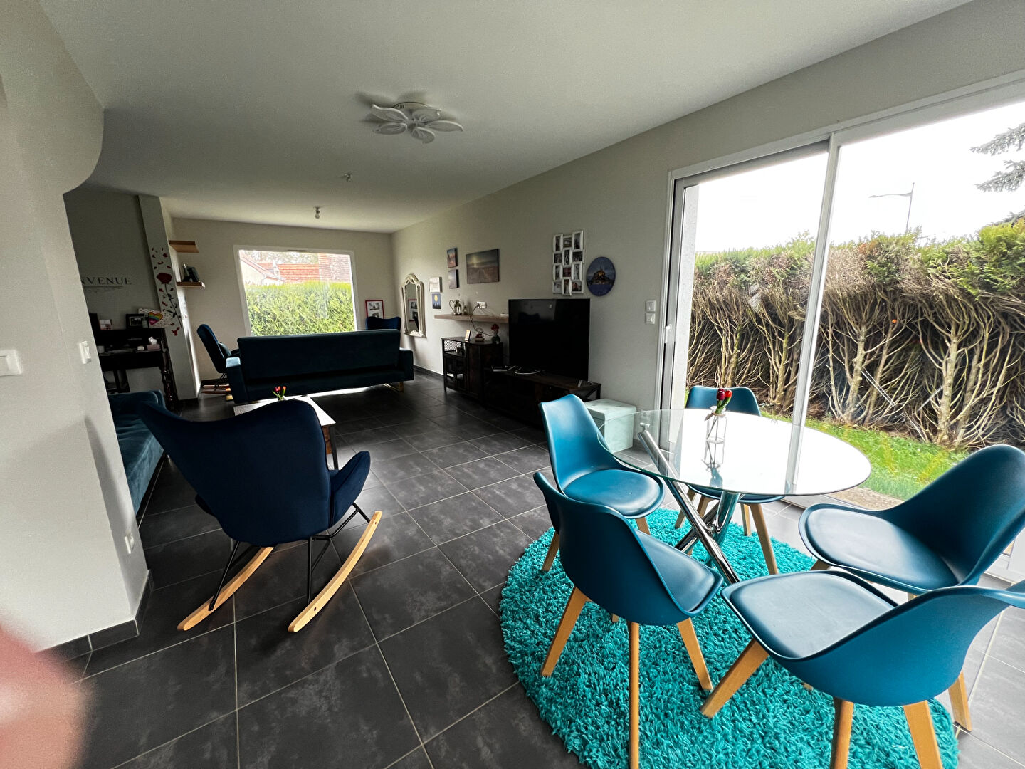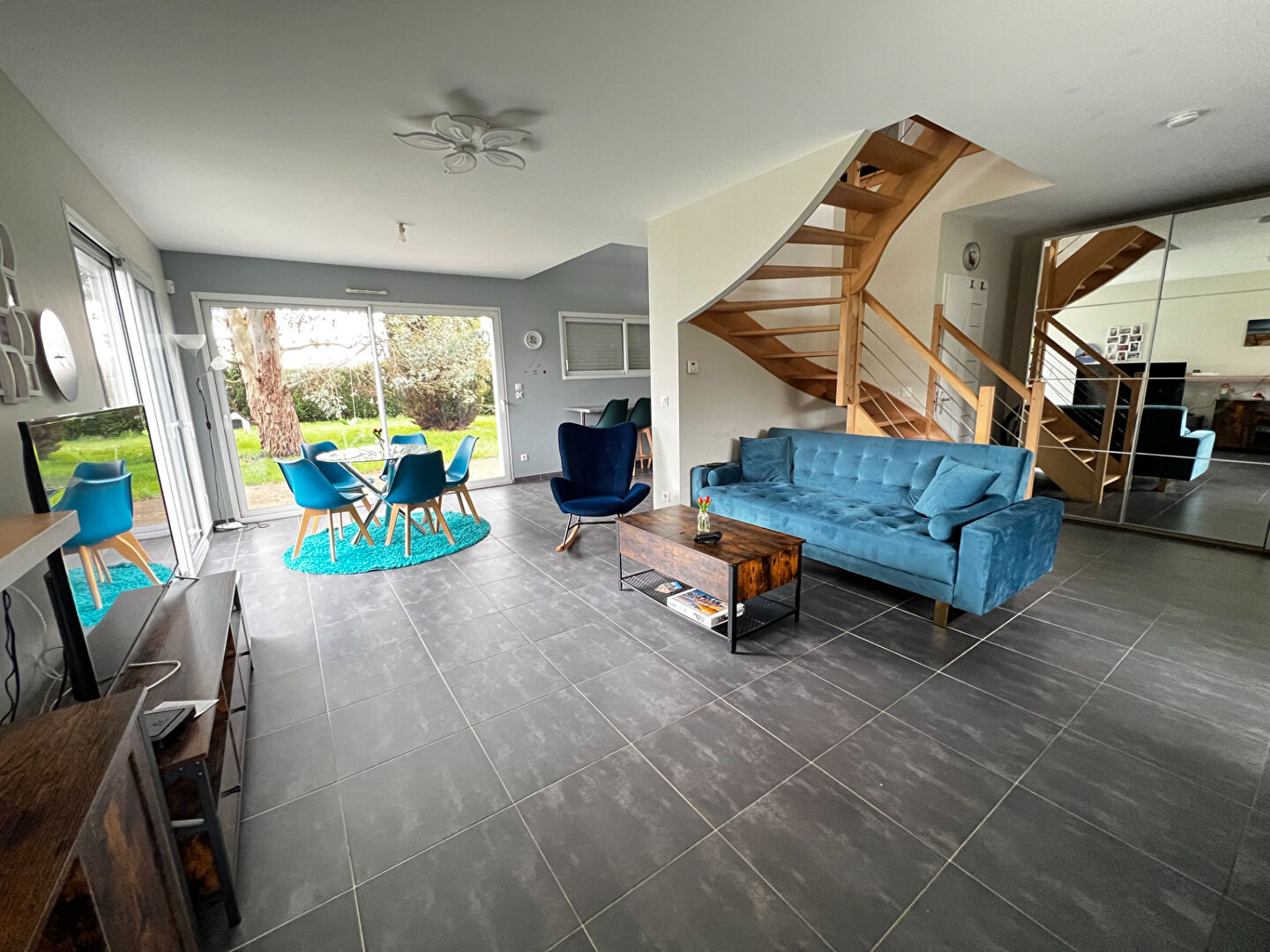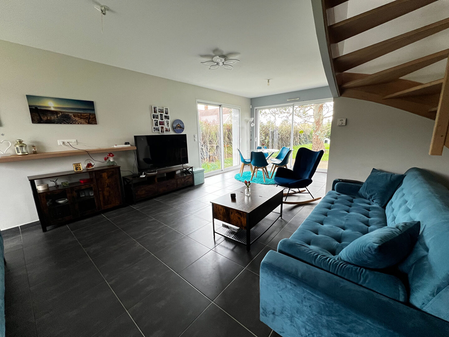 Dès l'entrée, vous découvrirez un vaste séjour lumineux, ouvert sur une cuisine aménagée et entièrement équipée, offrant un espace de vie convivial et fonctionnel. Une buanderie pratique, un WC indépendant ainsi qu'un garage complètent le rez-de-chaussée.