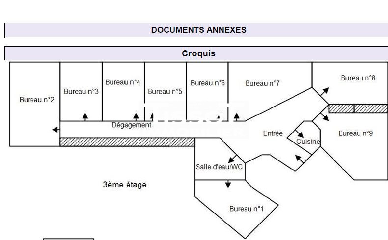 L'agencement se compose d'un hall d'accueil, de 7 bureaux indépendants, d'une salle de réunion, ainsi que d'un espace tisanerie/cuisine fermé. Deux sanitaires privatifs complètent l'ensemble, ainsi qu'une pièce de stockage pouvant également permettre la création d'une seconde entrée indépendante. De nombreux rangements sont intégrés dans les circulations.
