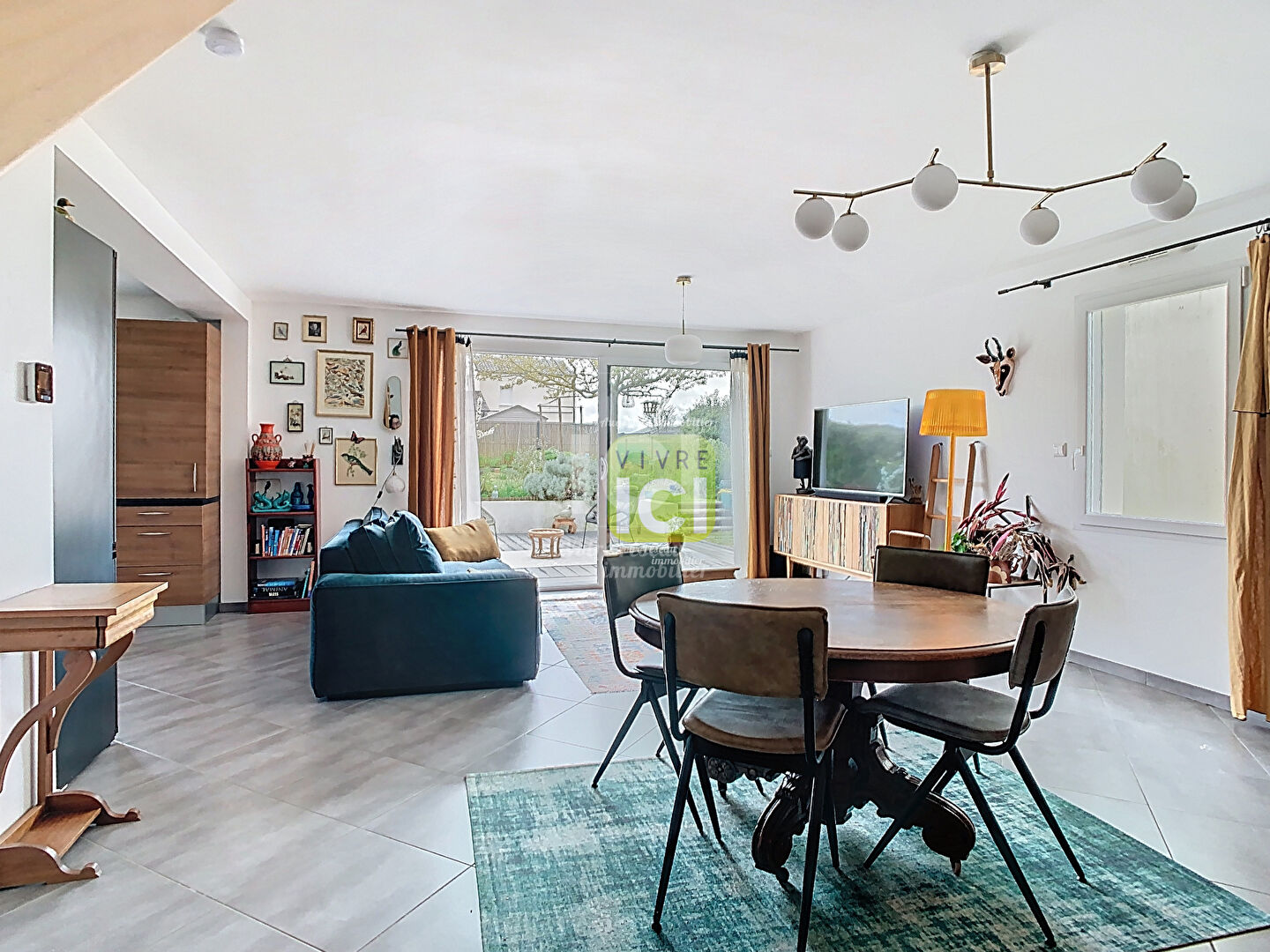 Au rez-de-chaussée : un vaste salon séjour très lumineux , une cuisine aménagée équipée ouverte , un cellier et toilettes indépendantes .