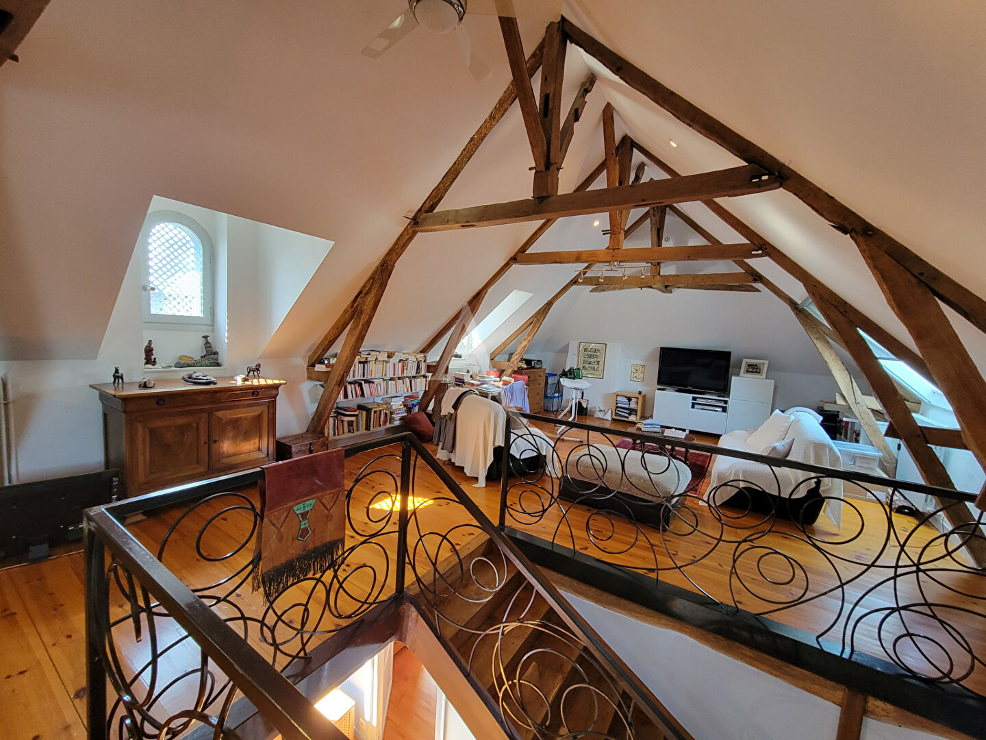 La maison de 300 m² comprend un salon, une salle à manger, une cuisine aménagée et équipée avec coin repas, 4 chambres, un bureau, et un magnifique espace combles aménagées de 75 m² .