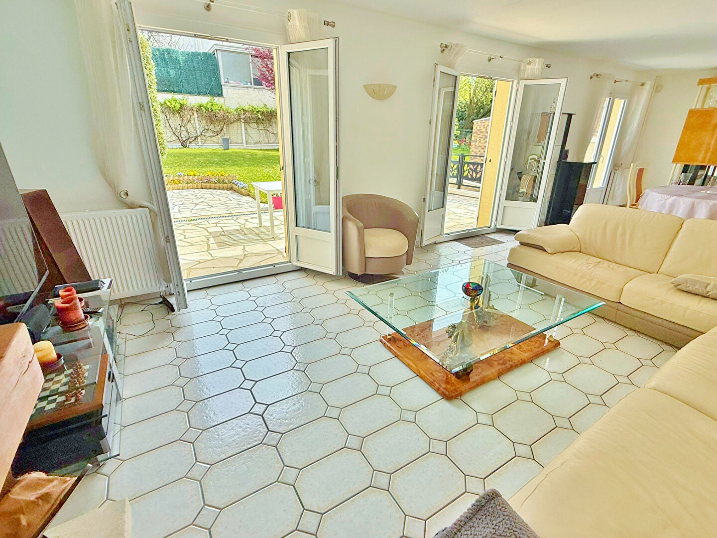 Dès l'entrée, vous découvrirez un espace accueillant avec placard intégré, menant à une cuisine contemporaine entièrement équipée et conviviale, pensée pour les moments de partage en famille ou entre amis. Le double séjour, particulièrement lumineux grâce à ses larges ouvertures, propose un espace de vie chaleureux et agréable. Il s'ouvre directement sur une belle terrasse et un jardin arboré, soigneusement entretenu, parfait pour profiter des beaux jours, organiser des repas en extérieur ou simplement se détendre en toute intimité.