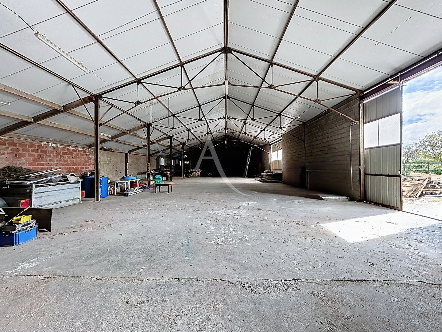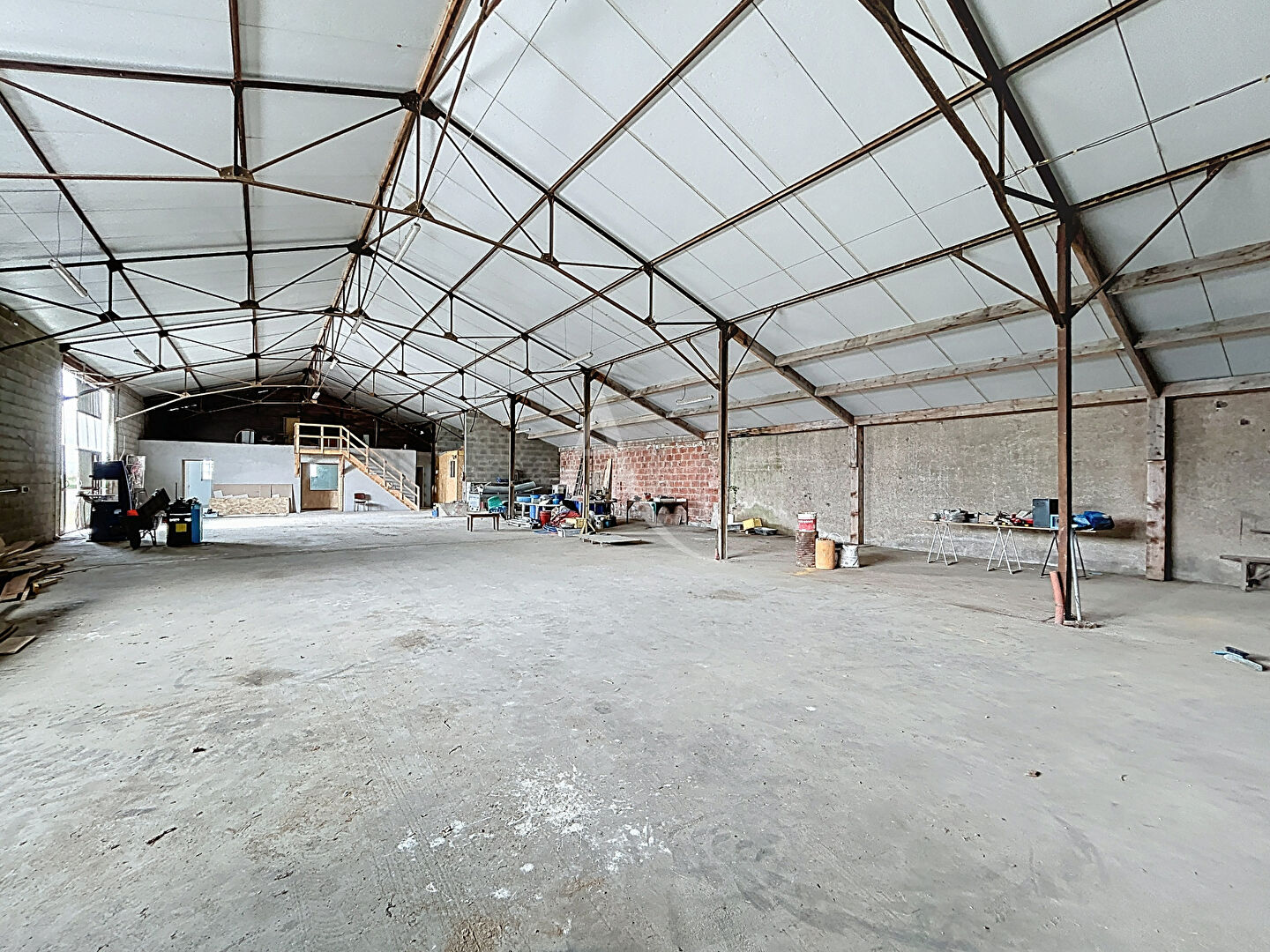 Le bâtiment propose un vaste entrepôt, qui est complété par environ 80 m² de pièces diverses isolées : plusieurs bureaux, ainsi que salle d'eau, et wc.