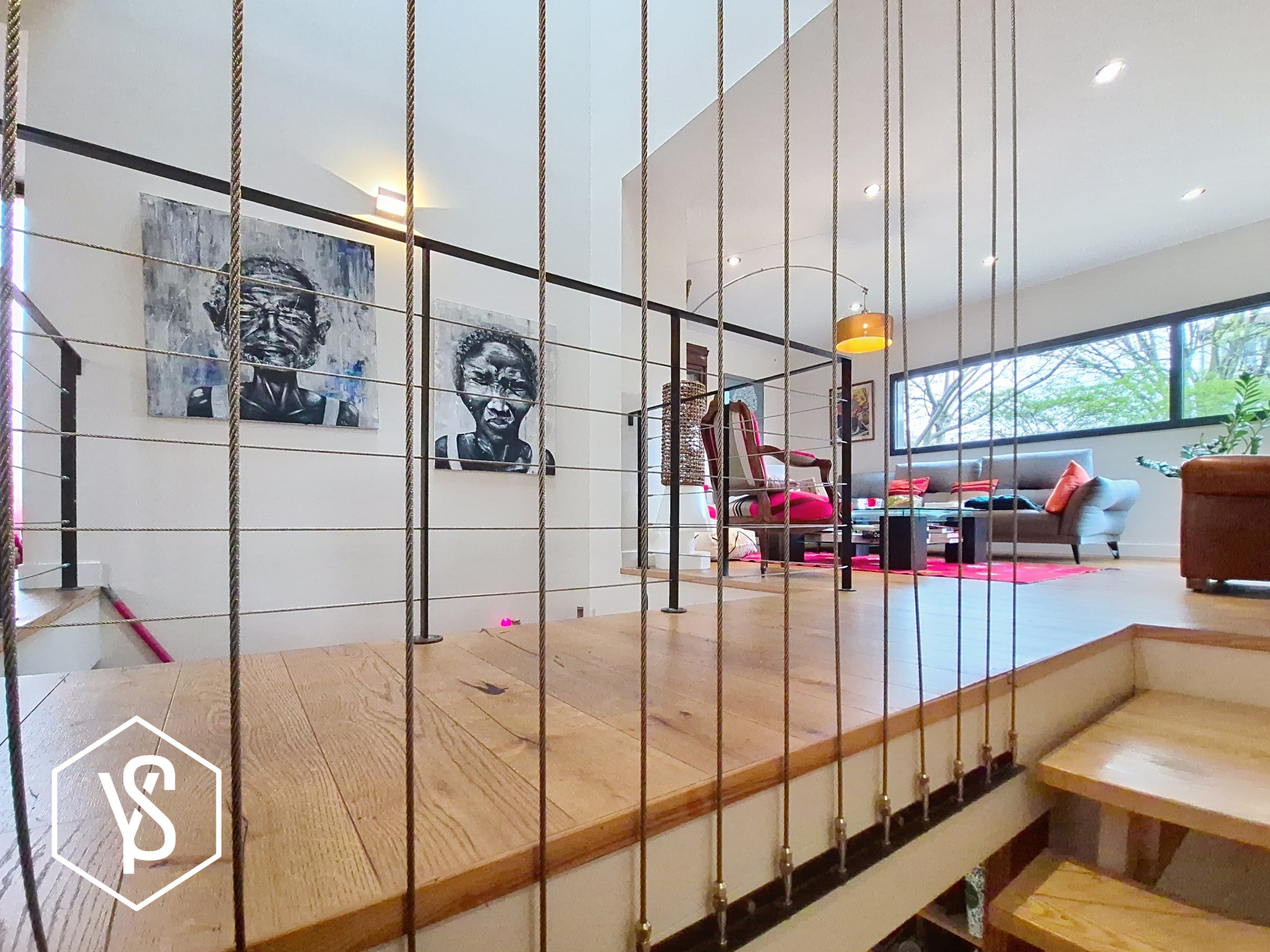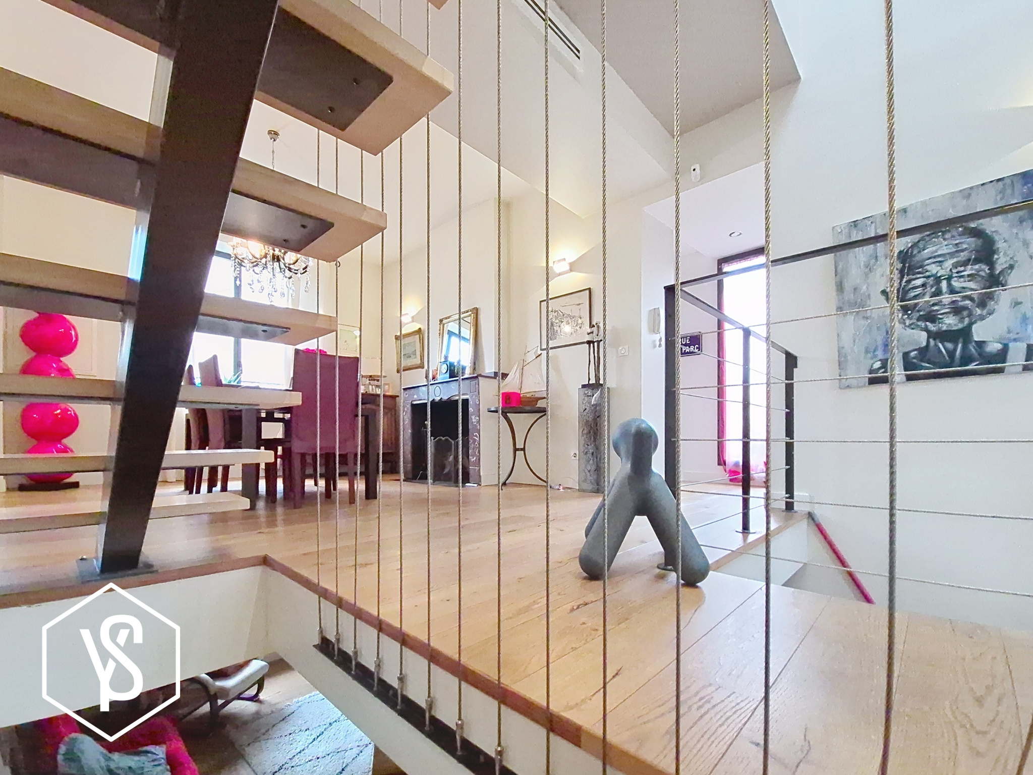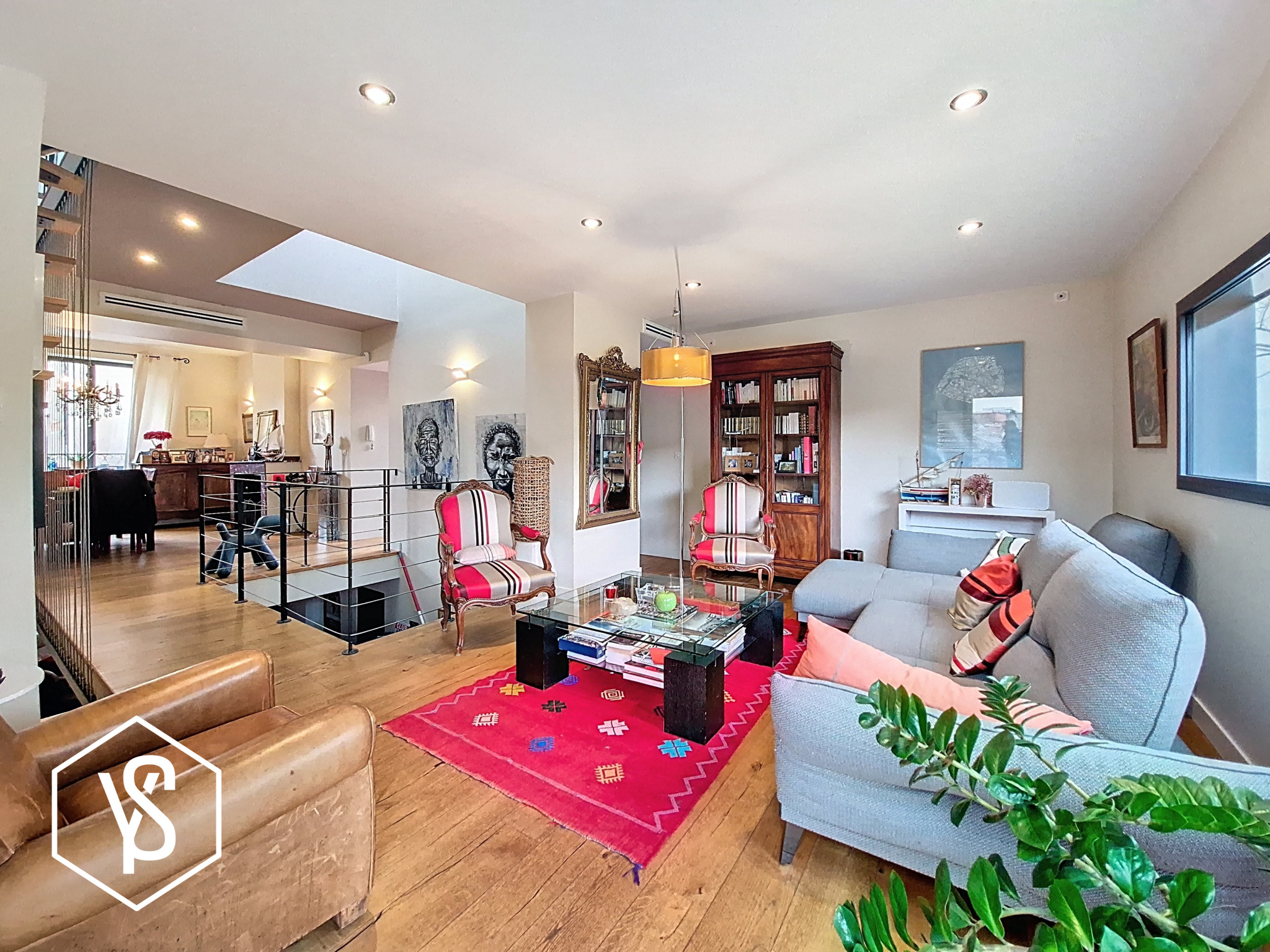 Étage : Trois grandes chambres, une salle d'eau, des WC séparés, ainsi qu'un espace bureau aménagé dans le dégagement, sublimé par un puits de lumière.