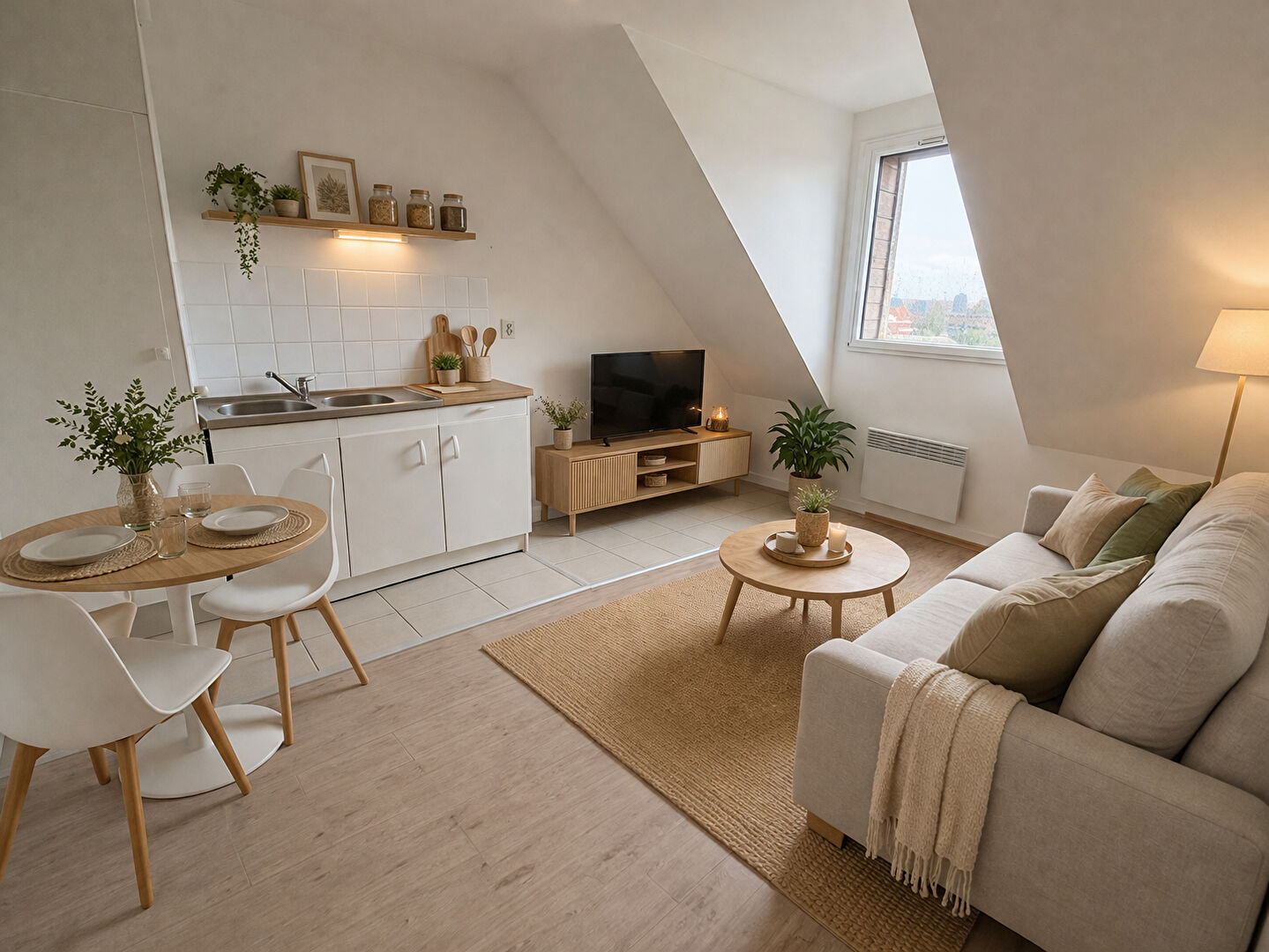 Un appartement de type 2 comprenant : un séjour avec un coin cuisine, une salle d'eau avec wc, une chambre avec placard.
