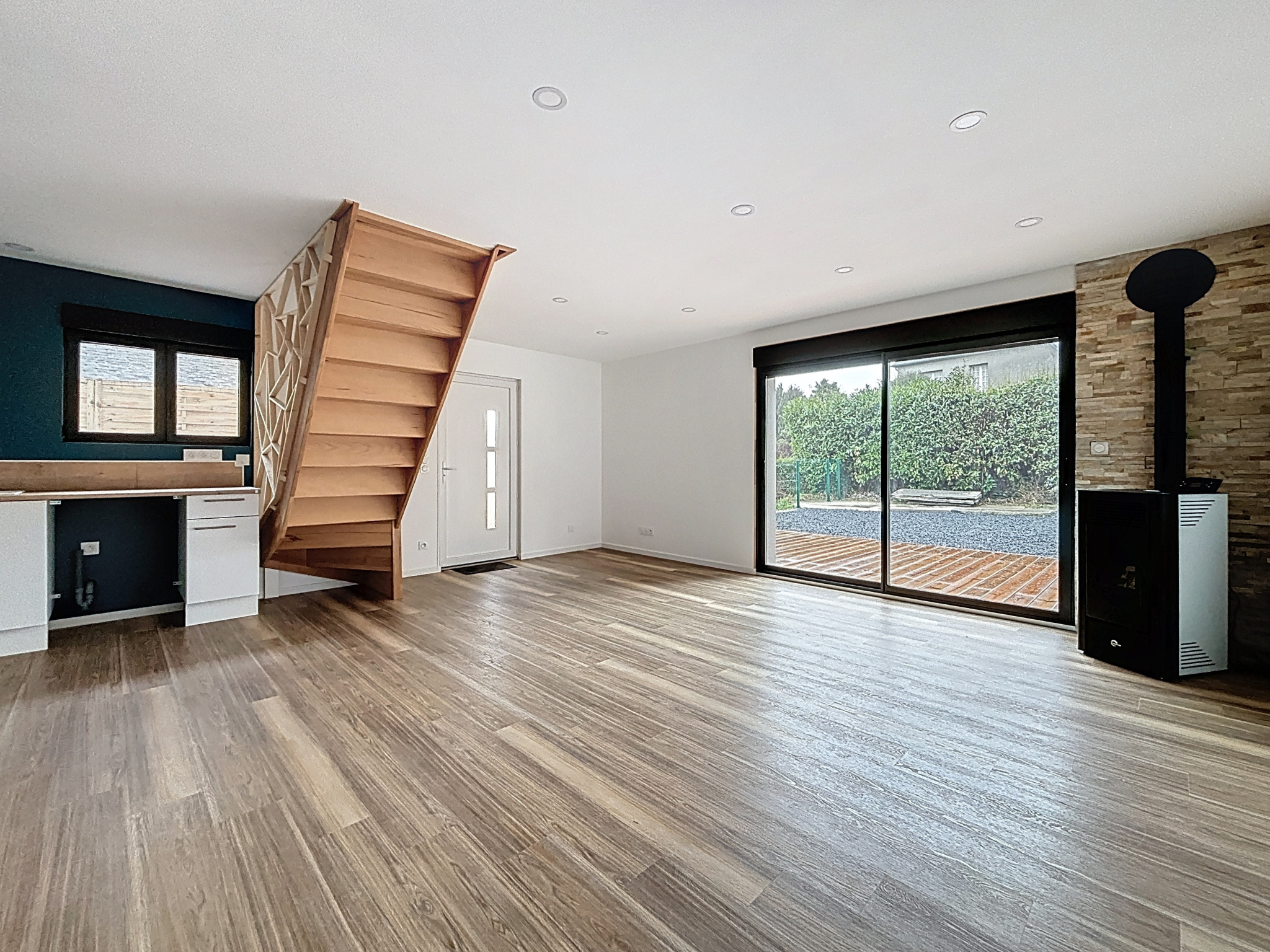 La maison est composée d'une pièce de vie lumineuse équipée d'un poêle à granules, une cuisine aménagée, ouverte sur le séjour, avec accès à une terrasse une buanderie et un WC séparé. À l'étage, l'espace nuit se compose de deux chambres confortables et d'une salle d'eau avec WC.