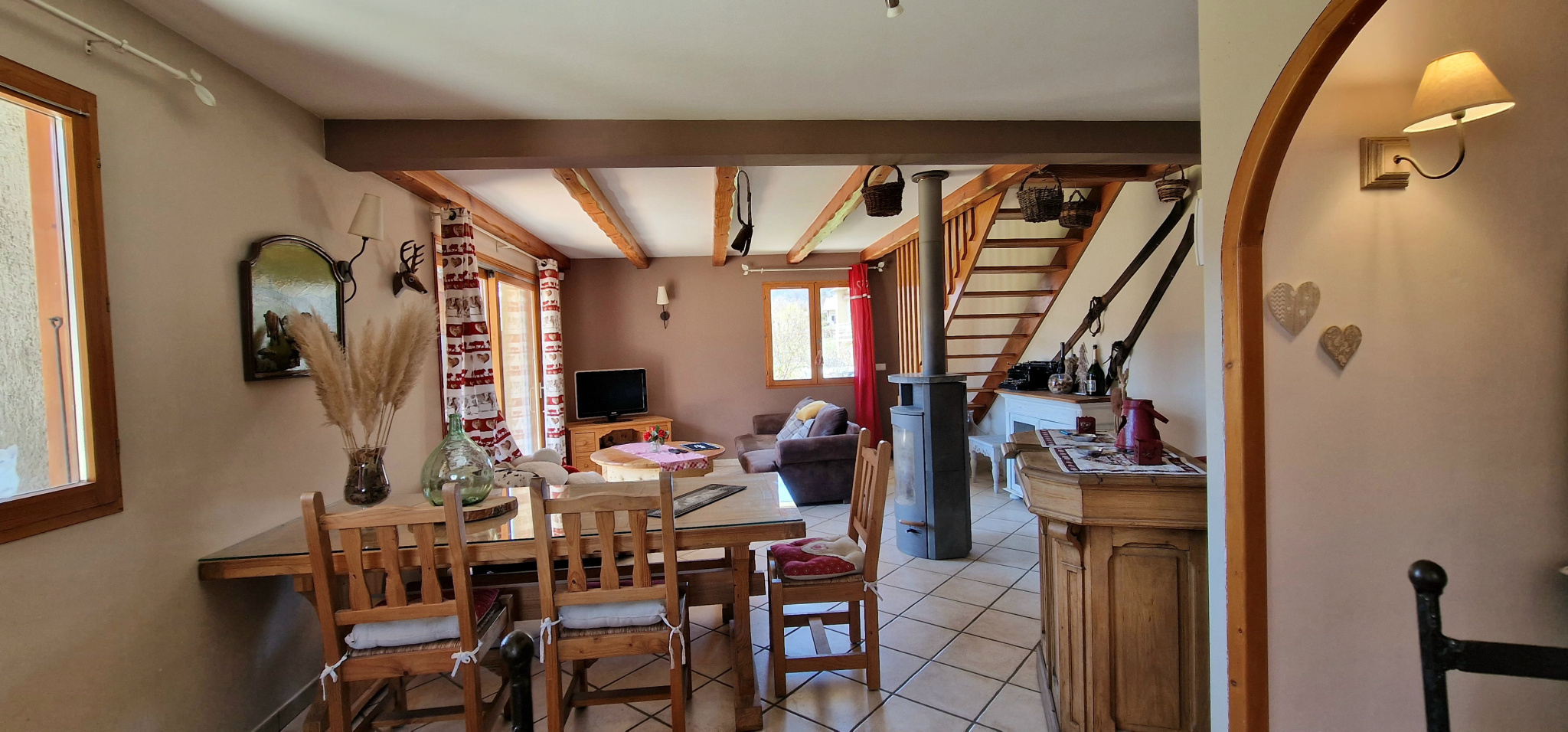 Au rez-de-chaussée : une chambre spacieuse, un espace cuisine-séjour lumineux avec poêle à bois, WC, salle d'eau avec douche.