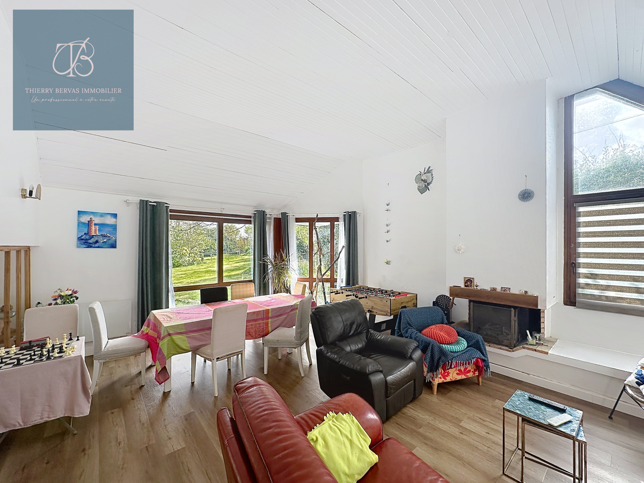 La maison principale, d'une surface d'environ 170 m2, se compose au rez-de-chaussée d'une entrée desservant une cuisine aménagée et équipée, ainsi qu'un vaste salon-séjour chaleureux avec cheminée. Ce dernier bénéficie d'un accès direct au jardin et se distingue par un plafond cathédrale, apportant volume et luminosité, dans une extension réalisée en 2020. Vous trouverez également trois chambres, une salle de bains et un WC.