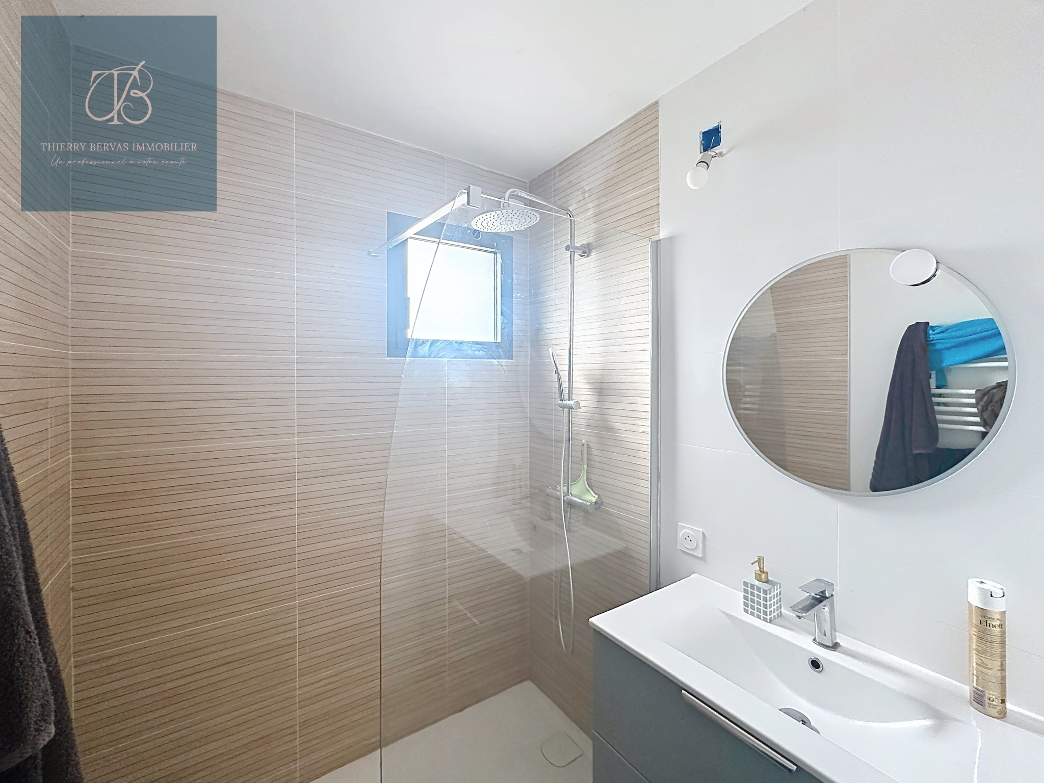 À l'étage, l'espace nuit se poursuit avec trois chambres supplémentaires, une salle de bains et un WC. Vous profiterez également d'une agréable vue mer depuis l'étage, ajoutant un véritable atout à cette propriété.