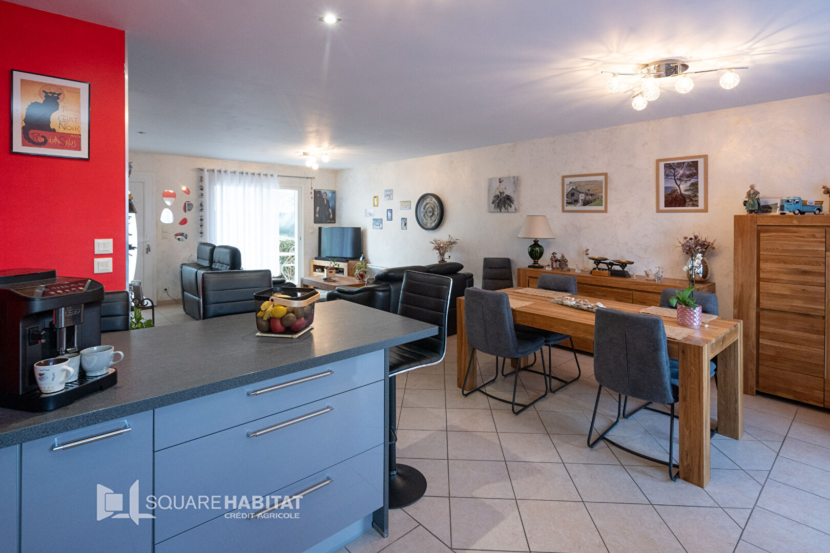 Elle se compose d'une belle pièce de vie lumineuse avec un grand salon/séjour traversant, offrant un accès direct à deux terrasses, idéal pour profiter des beaux jours. La cuisine ouverte, entièrement équipée et meublée, apporte convivialité et fonctionnalité à l'ensemble.